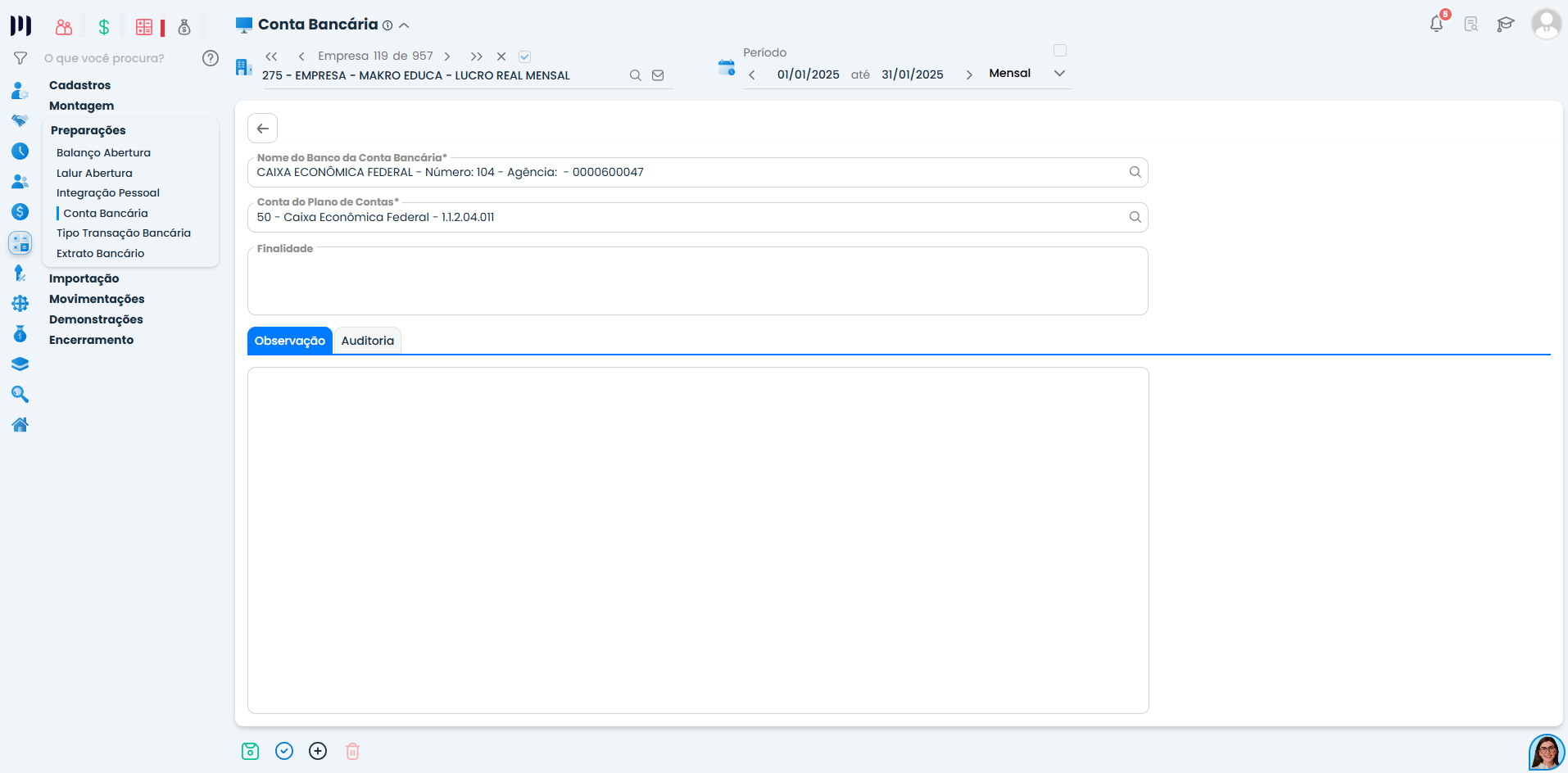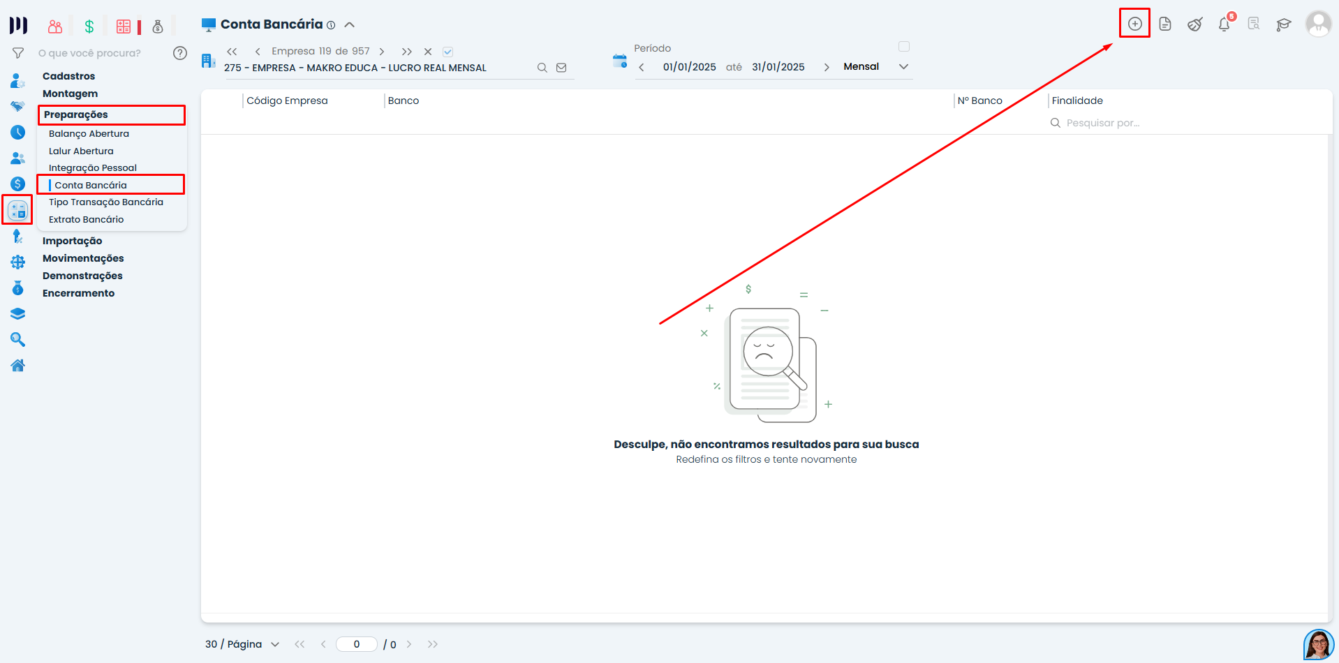 Acesse o menu Contábil > Preparações > Conta Bancária.