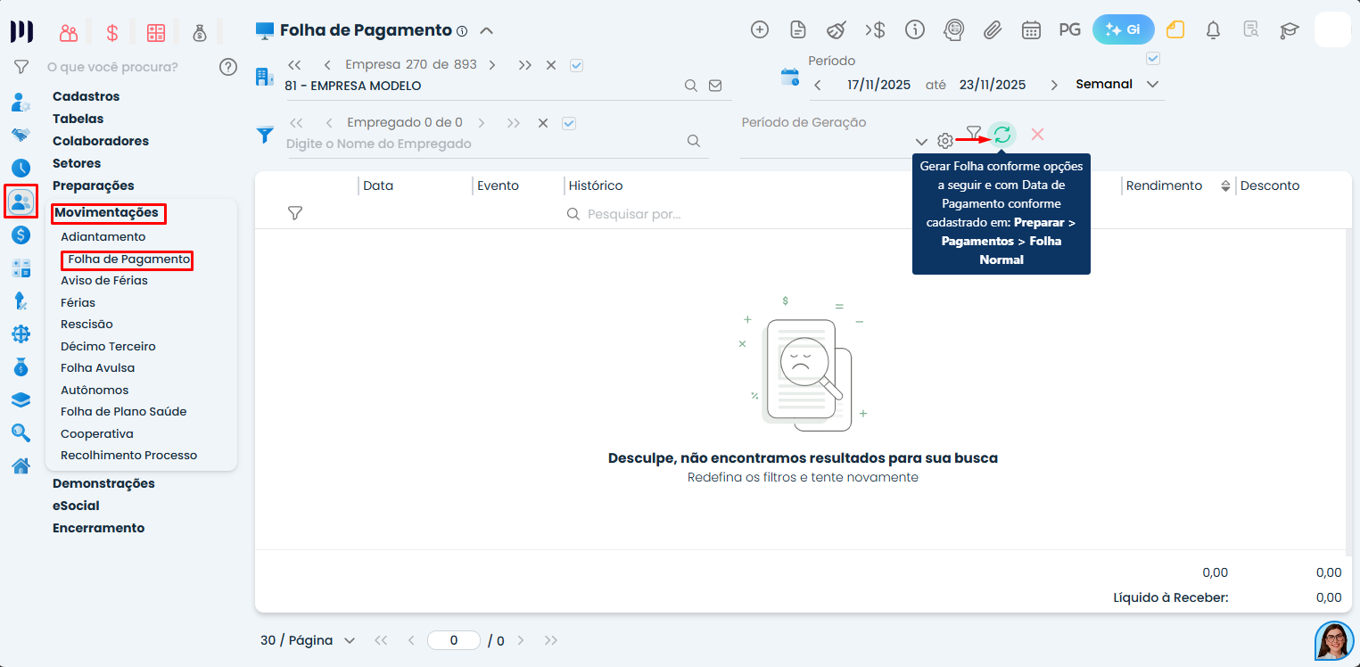 Passo 3: Para gerar a folha de pagamento, vá em Pessoal>Movimentações>Folha de Pagamento;