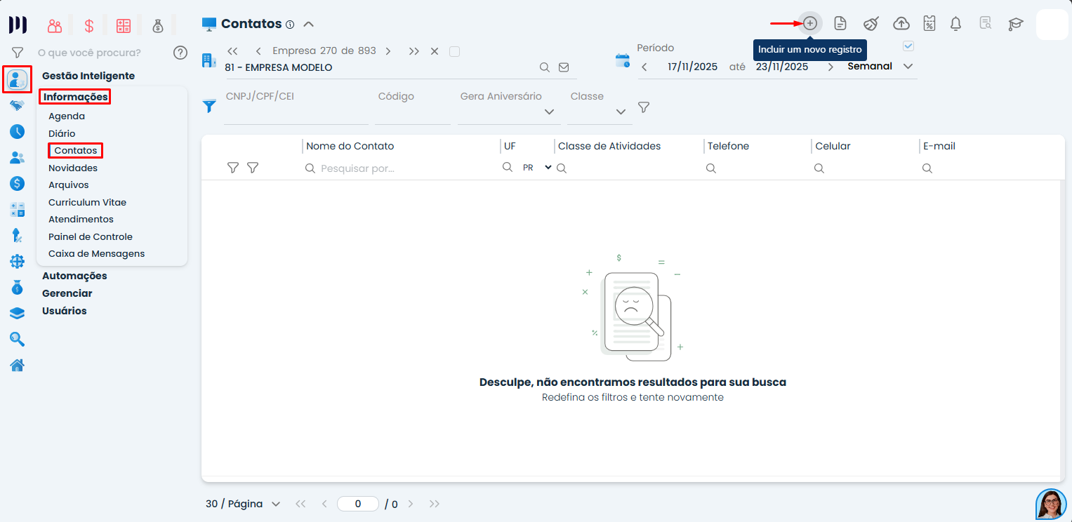 Passo 1: Acesse o menu Administrar>Informações>Contatos;