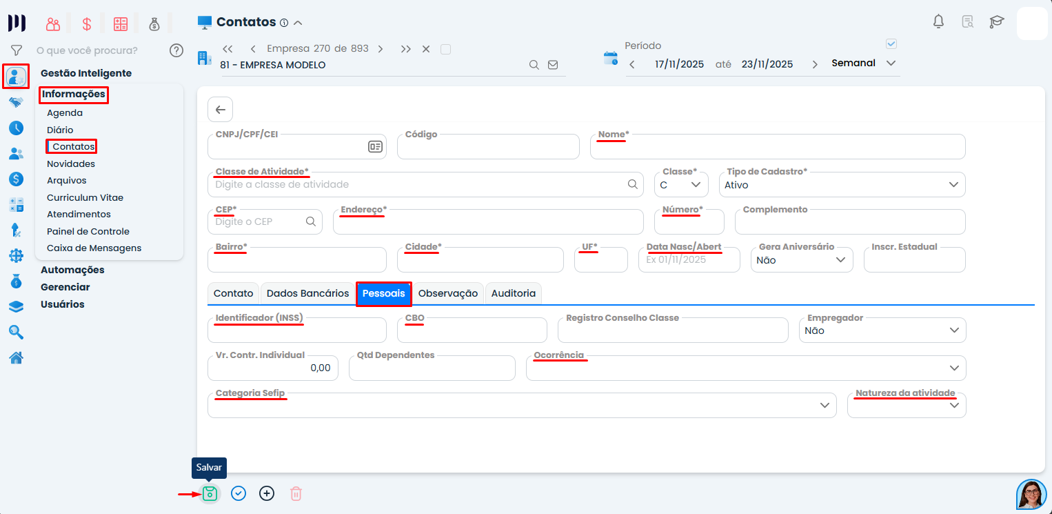 Cadastre em Administrar > Informações > Contatos, preenchendo dados do cabeçalho e pessoais como categoria SEFIP e PIS/NIS.