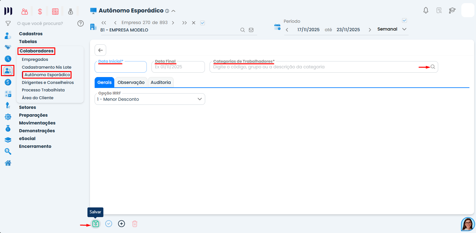 Passo 4: Acesse o menu Pessoal>Colaboradores>Autônomo Esporádico;