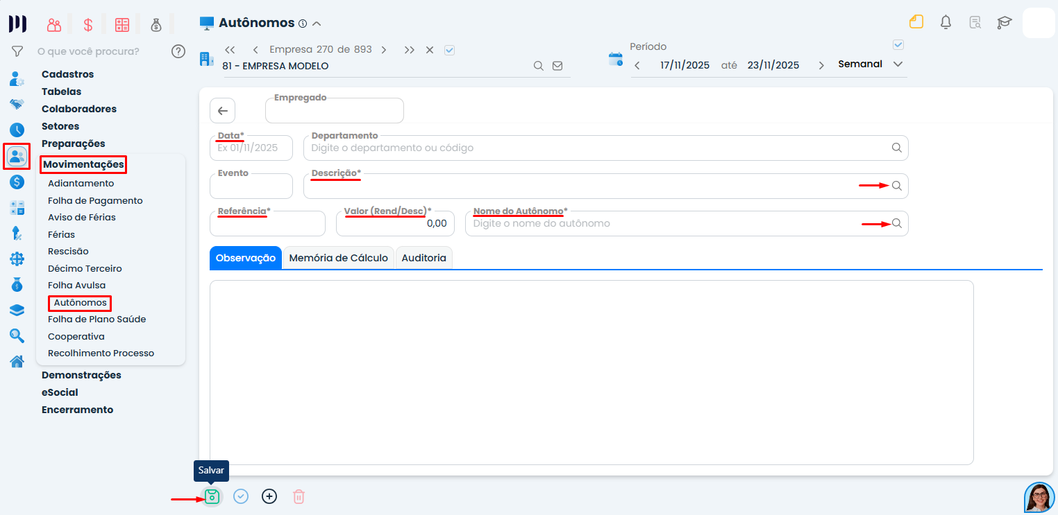 É possível cadastrar autônomos como autônomo fixo (recebe mensalmente) ou como autônomo esporádico (serviços pontuais).