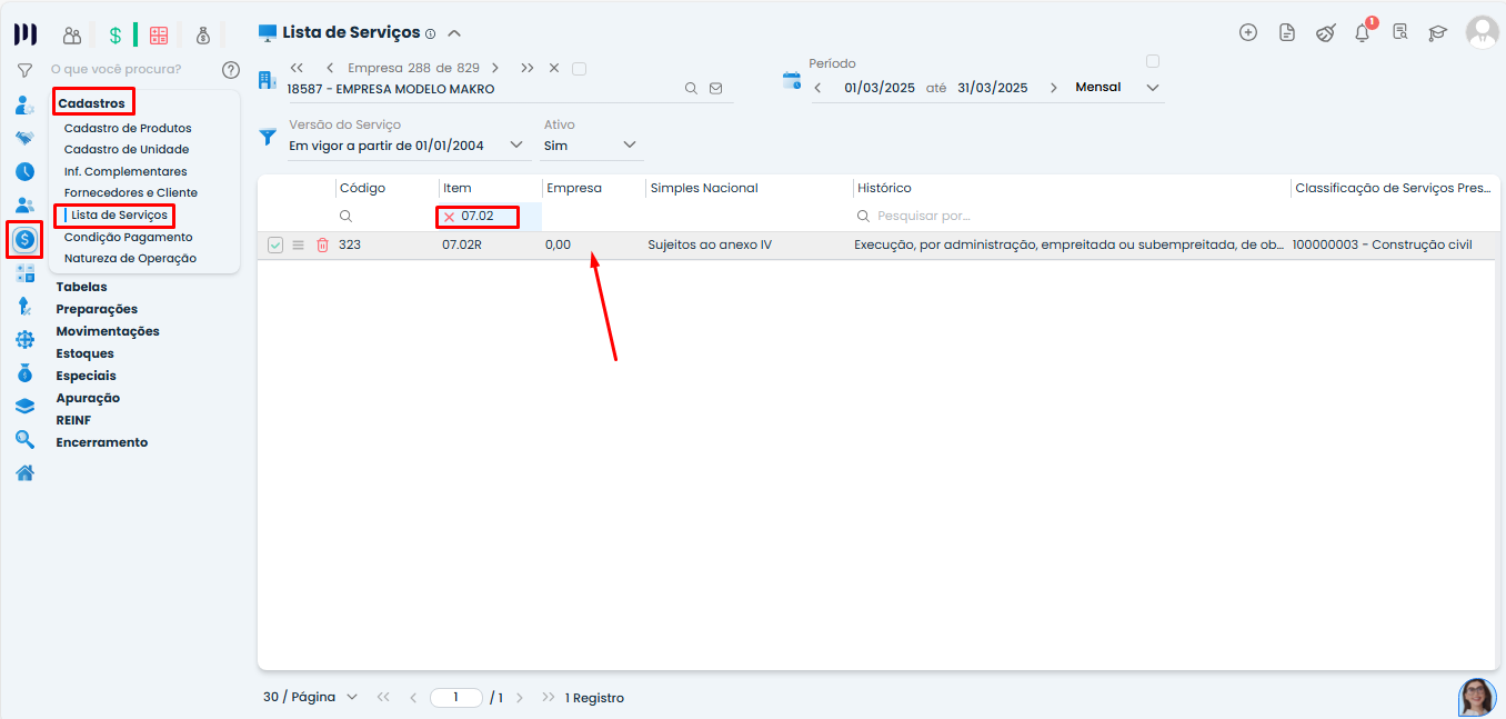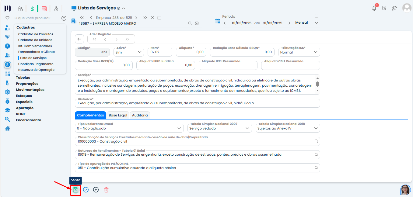 - Validação: necessidade de informar a Natureza da Atividade devido à classificação tributária da empresa;