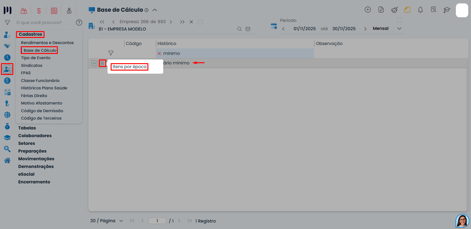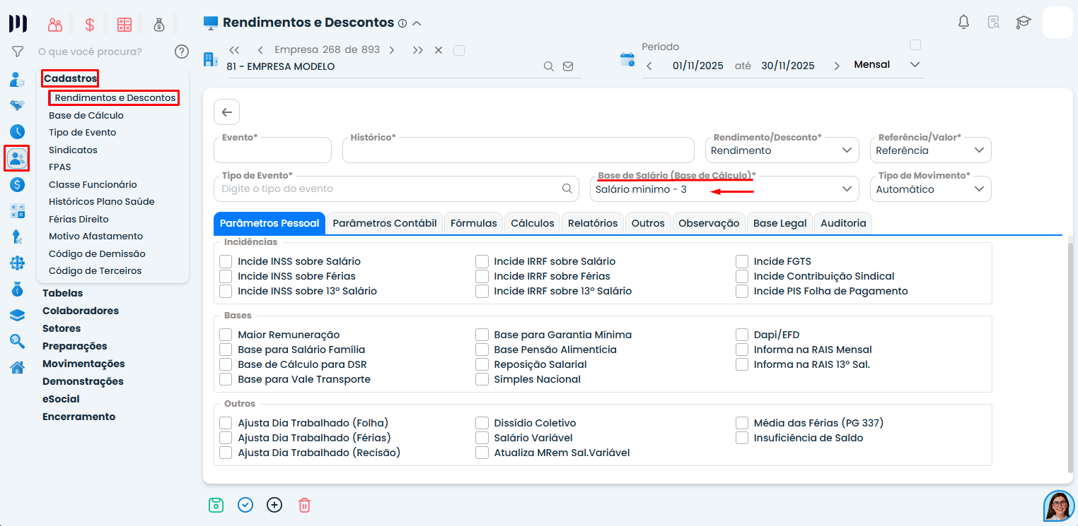 Passo 1: Acesse o menu Pessoal>Cadastros>Base de Cálculo;