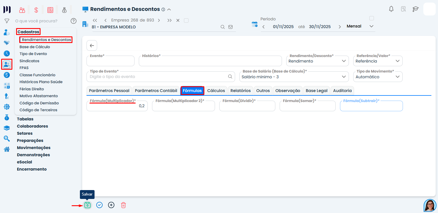 Passo 1: Acesse o menu Pessoal>Cadastros>Rendimentos e Descontos;