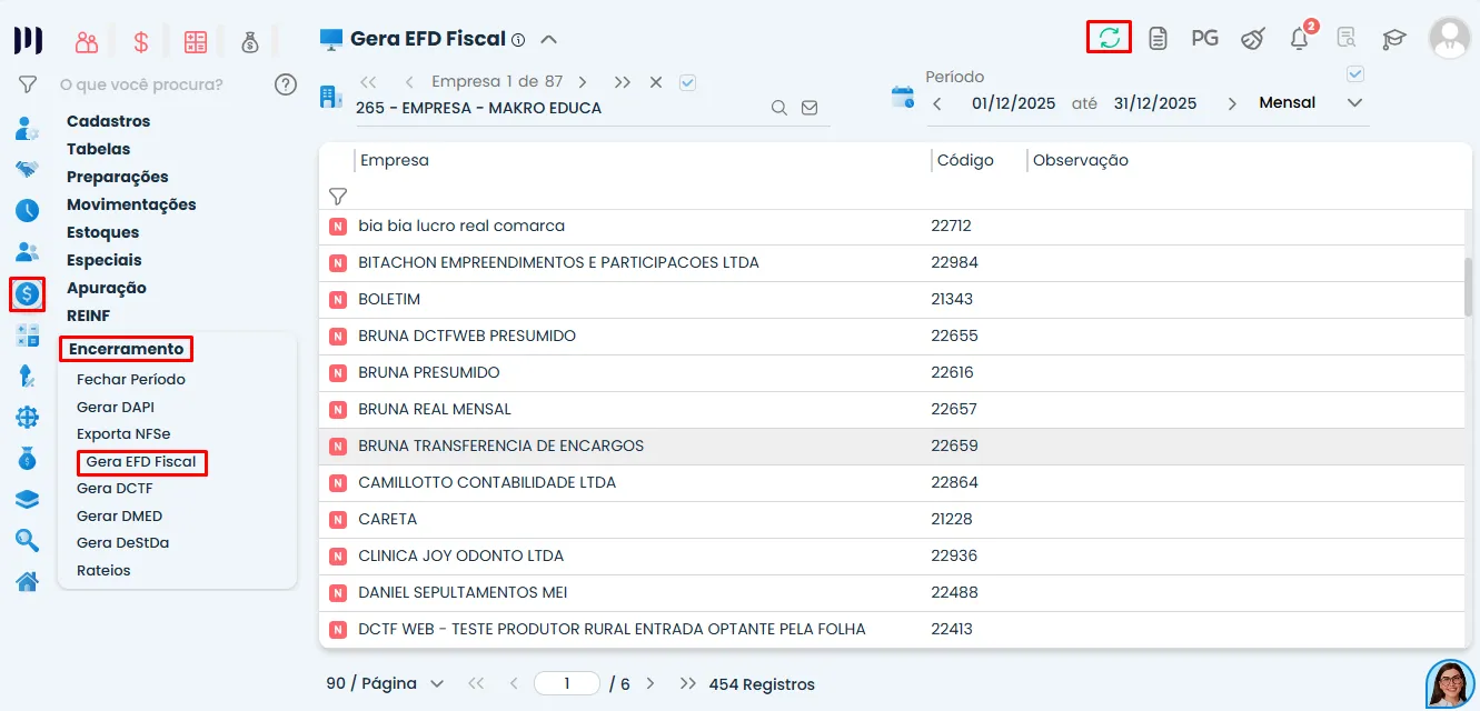 Tela do Sistema Contábil Makro exibindo menu Fiscal > Encerramento > Gera EFD Fiscal, com período 12/2025 selecionado para geração do Arquivo SPED ICMS/IPI.