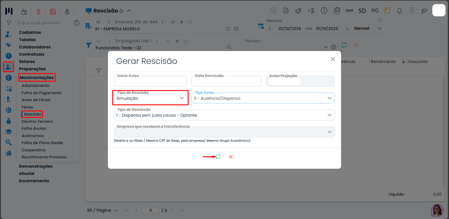 ⚠️ Atenção! Se a simulação da rescisão permanecer salva no sistema, ela poderá interferir no encerramento da folha de pagamento.