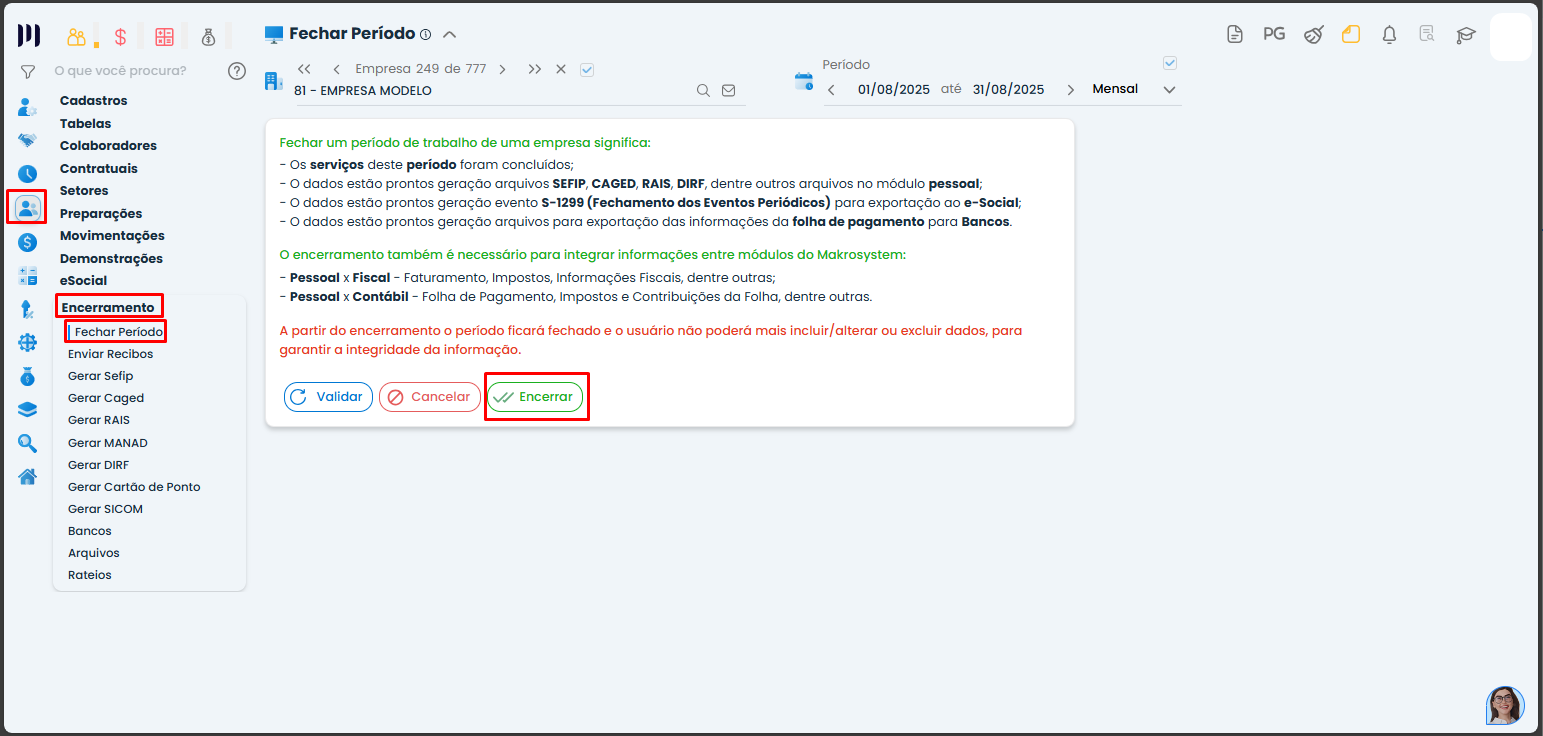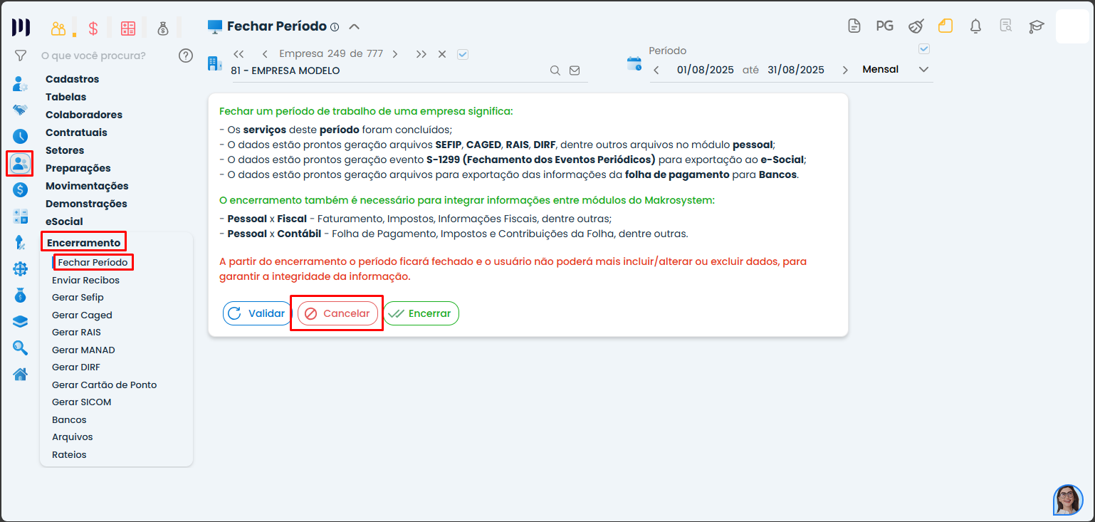 Passo 1: Acesse o menu Pessoal > Encerramento > Fechar Período e cancele os períodos existentes no sistema até o mês da mudança.