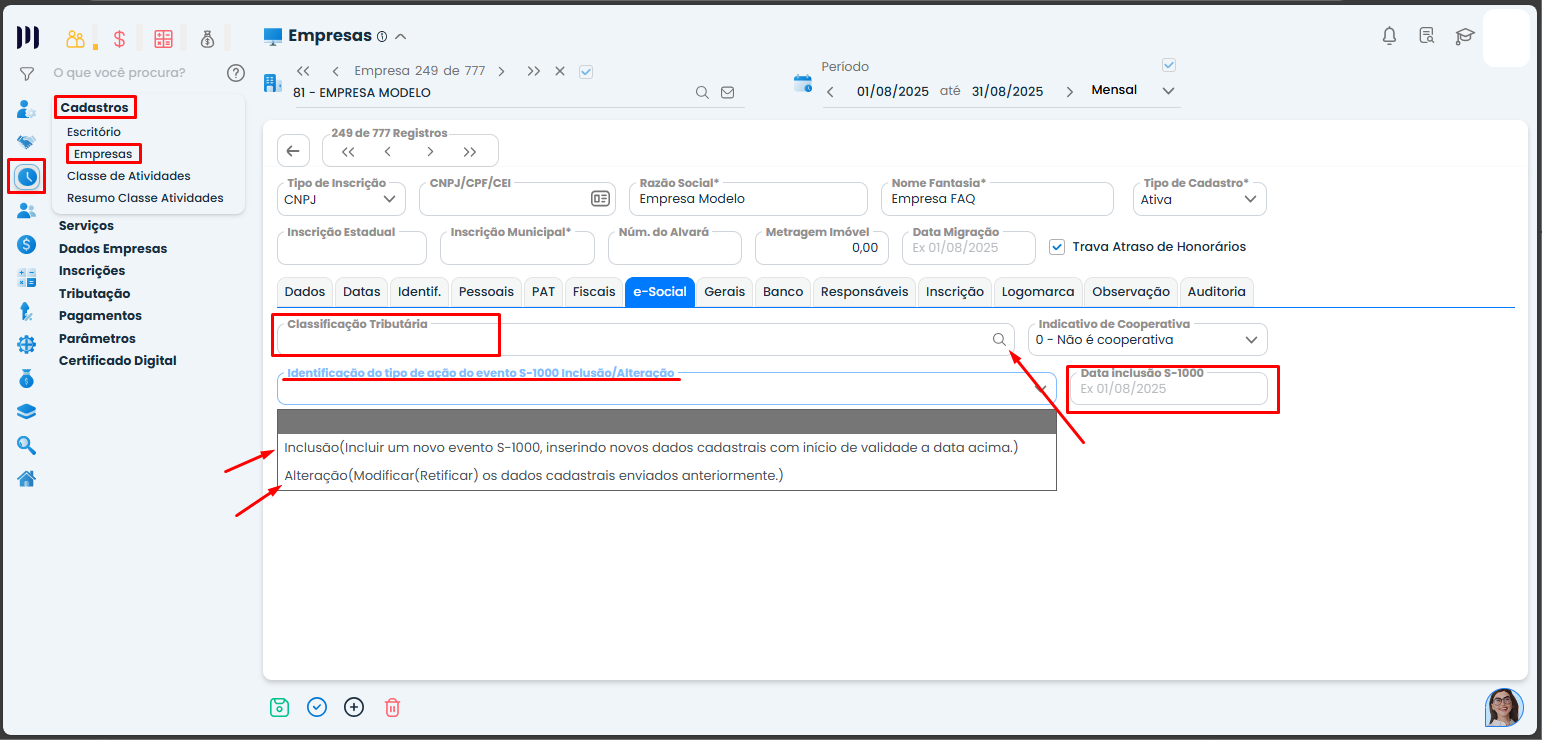 Selecione a empresa, entre na aba eSocial e altere o campo Classificação Tributária;