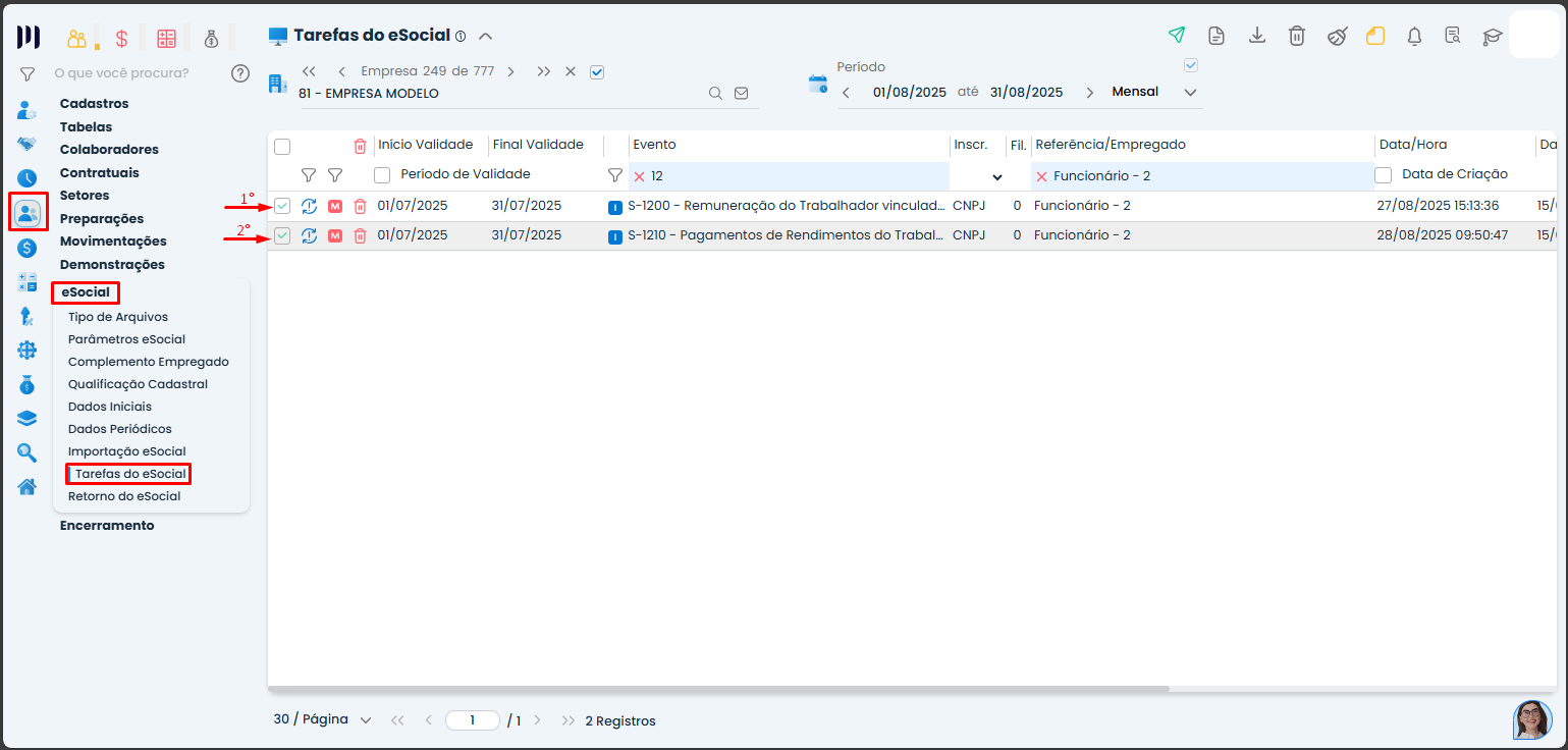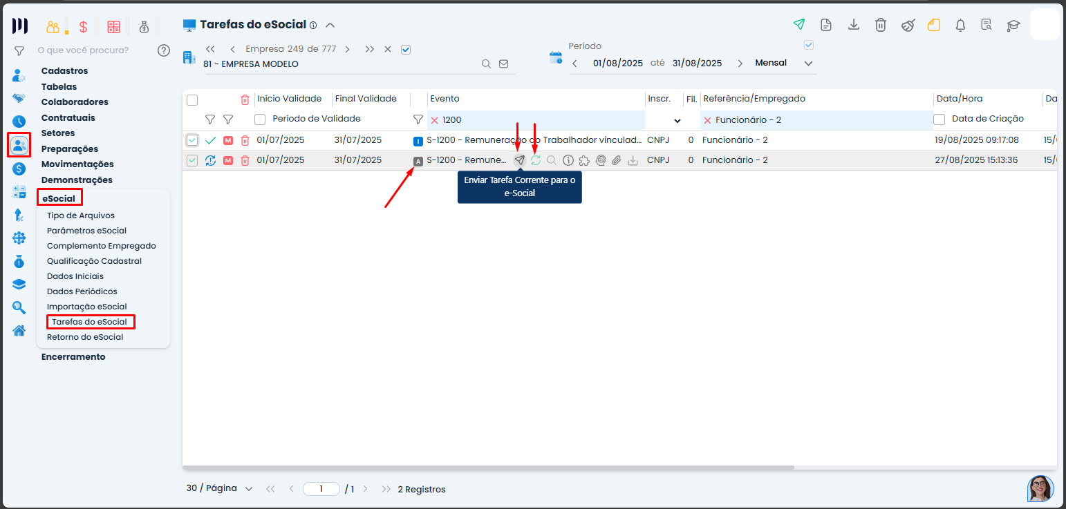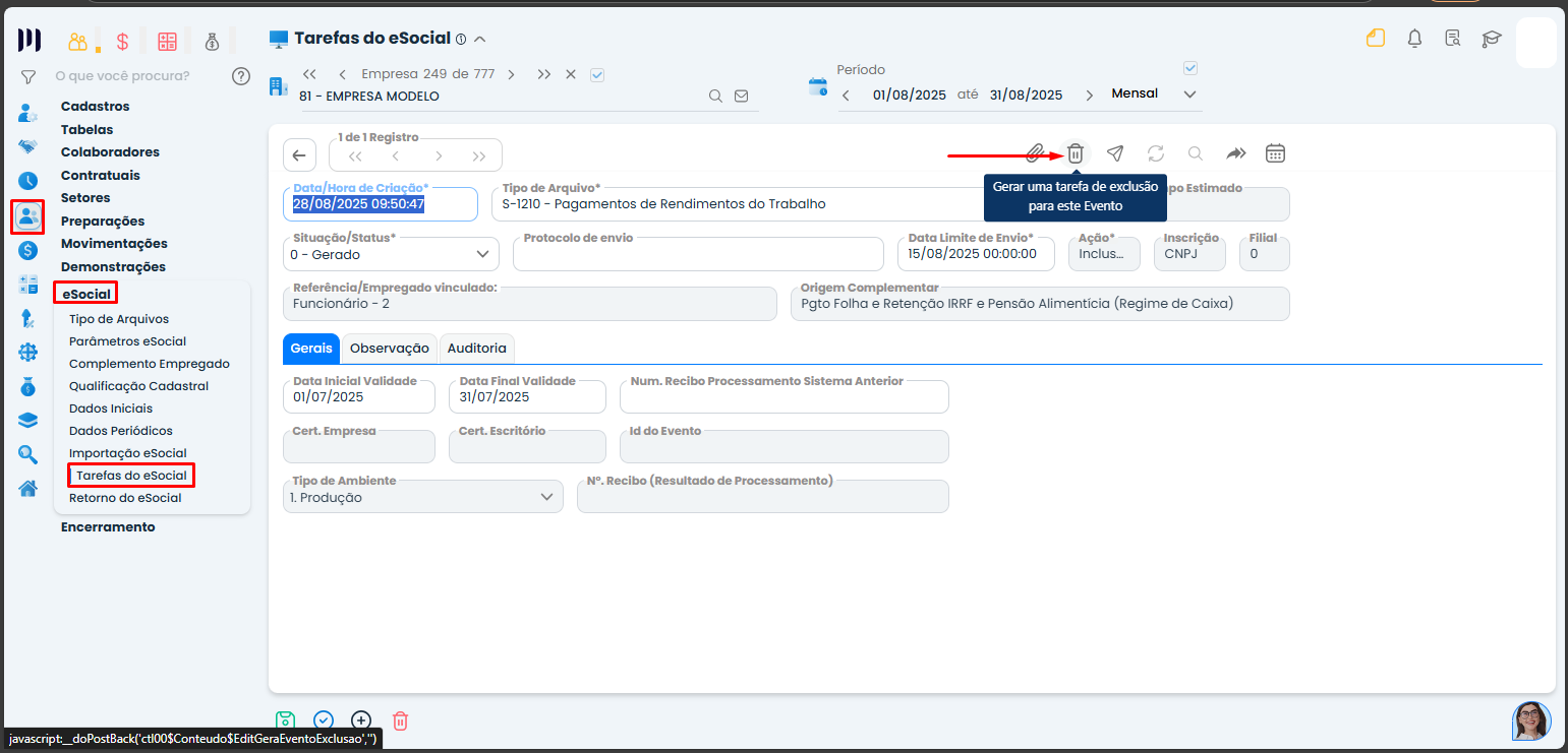 Após salvar a alteração, o sistema gerará automaticamente o evento S-1000 com a nova classificação. Envie-o ao eSocial.
