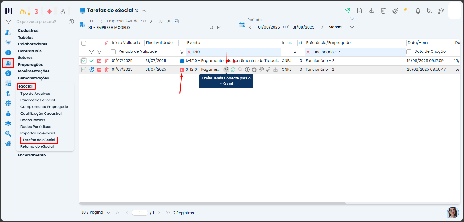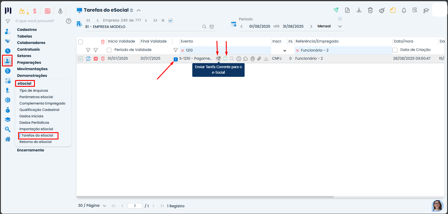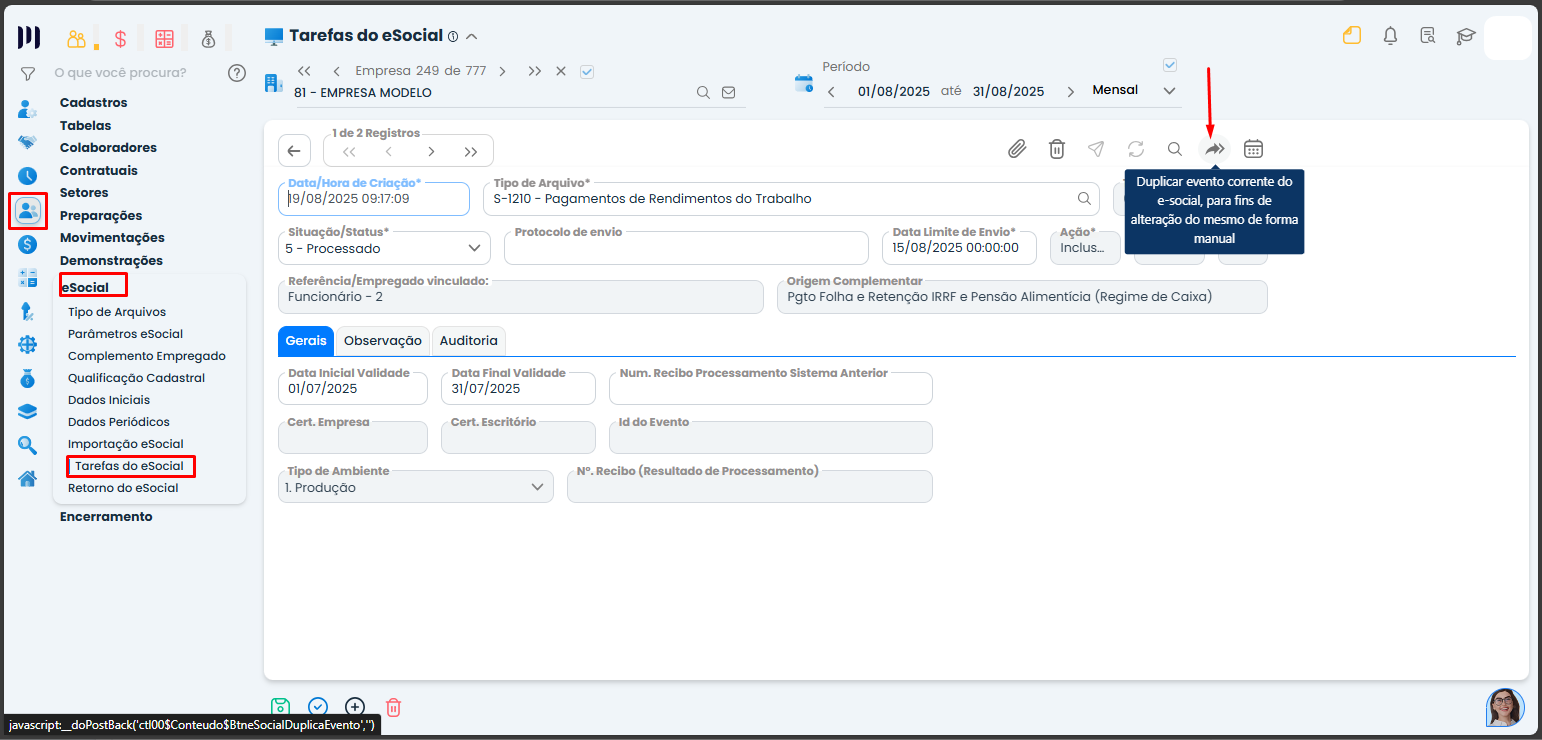 3. Depois do evento S-1200 processado, duplique e reenvie o S-1210 como inclusão.