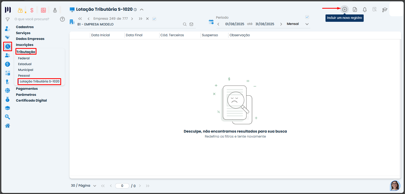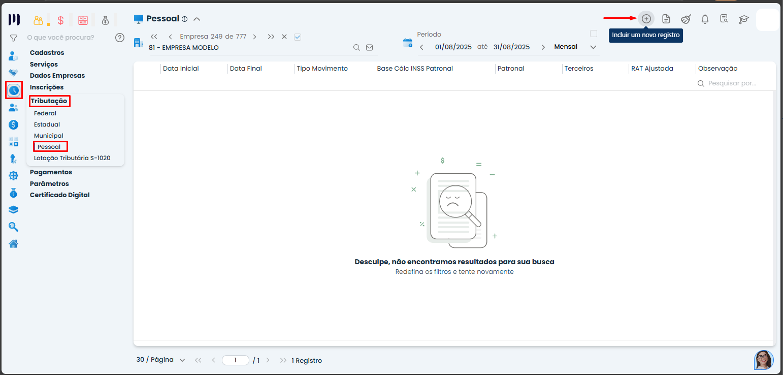 Cadastre nova tributação pessoal, em: Preparar>Tributação>Pessoal;
