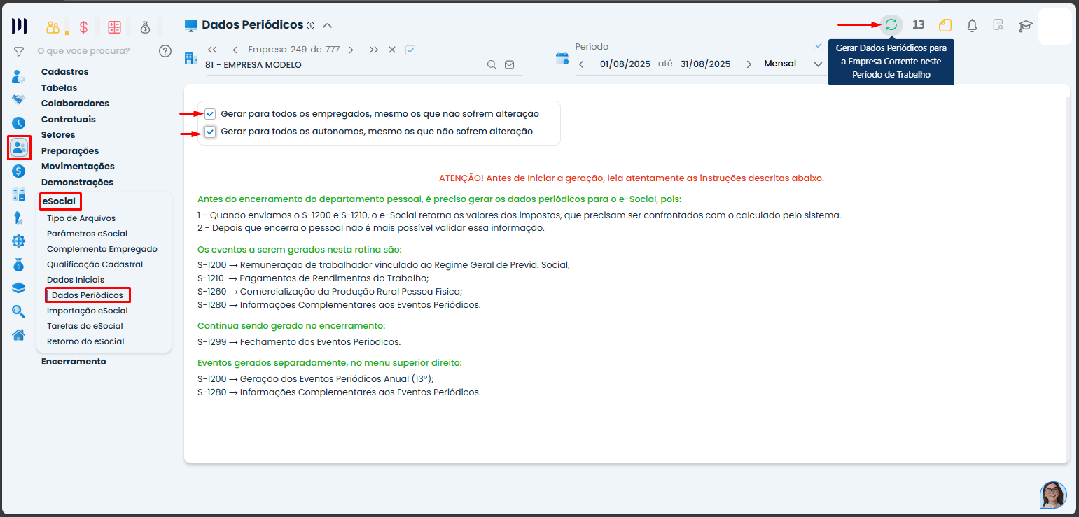 Vá em: Pessoal>eSocial>Dados Periódicos, selecione a opção “Gerar para todos os empregados, mesmo os que não sofrem alteração”, e clique no ícone ‘verde’ para gerar;