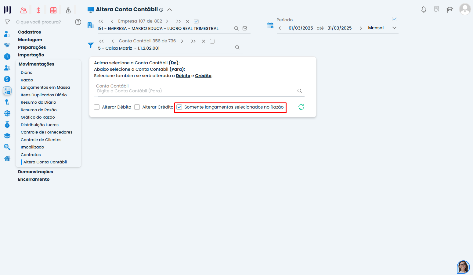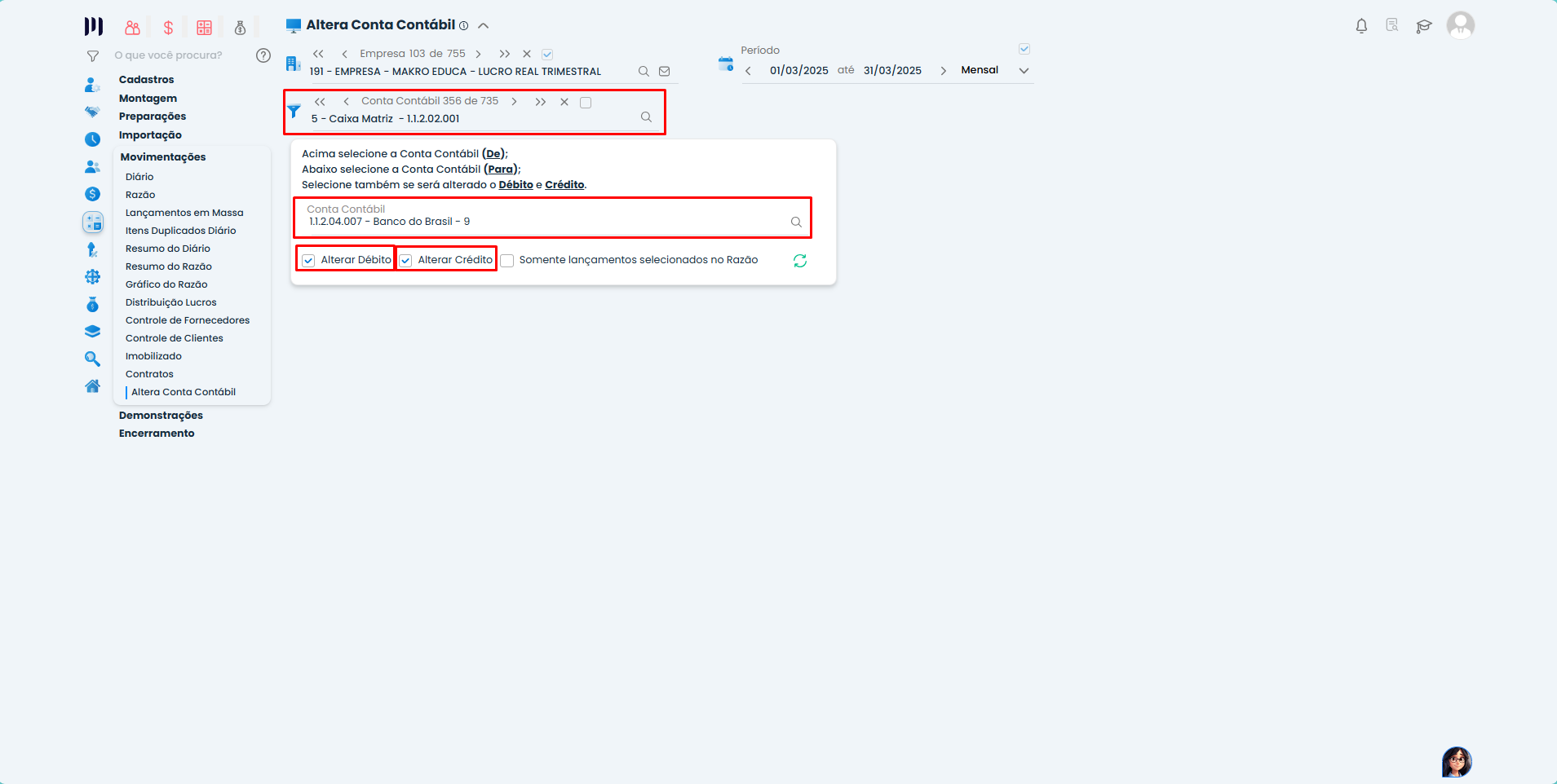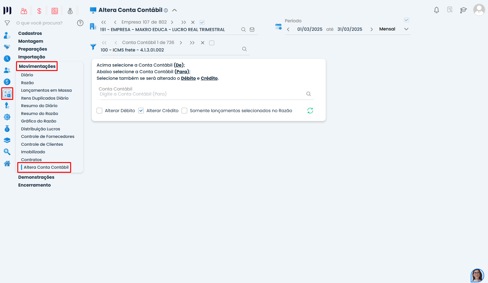 Vá para: Contábil > Movimentações > Altera Conta Contábil