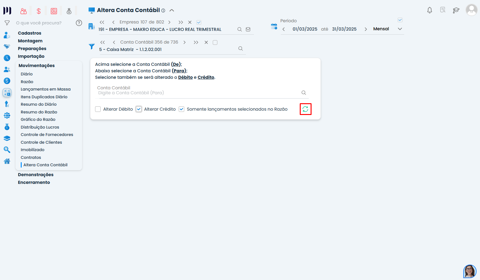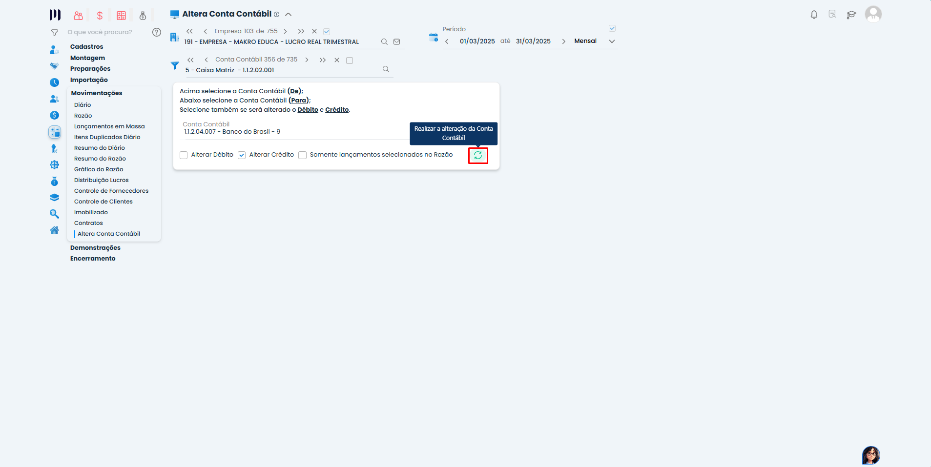 Clique no ícone “Realizar a alteração da Conta Contábil”