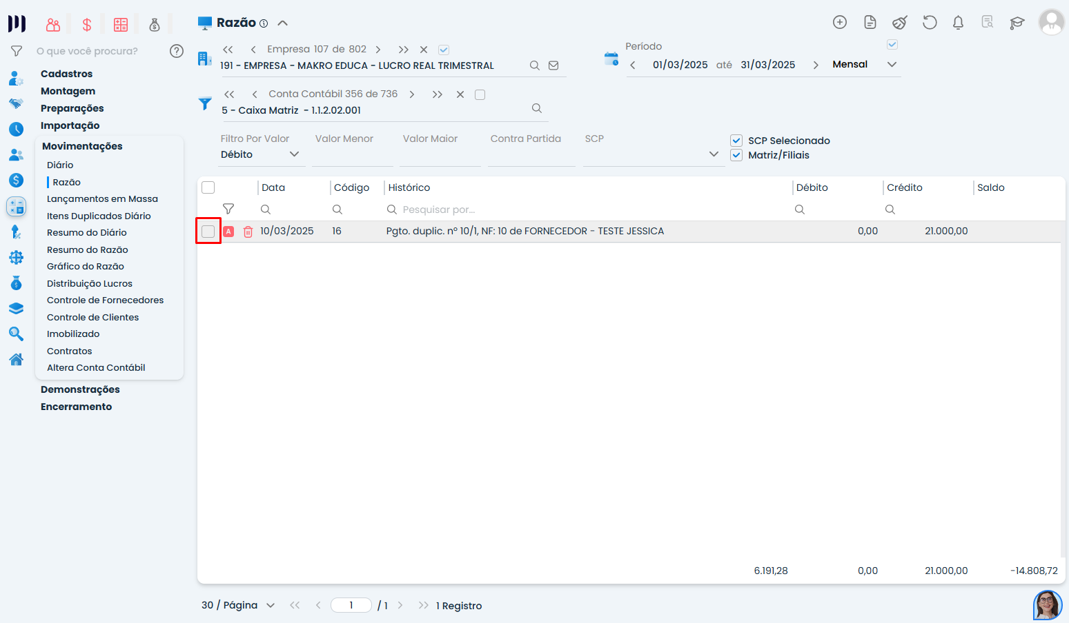 Marque a opção “Somente lançamentos selecionados no Razão”