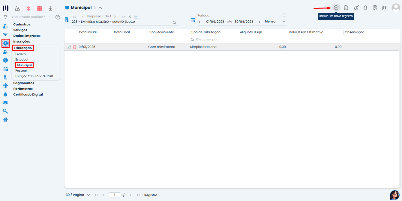 2. Clique no botão Incluir (símbolo “+”) para novo registro