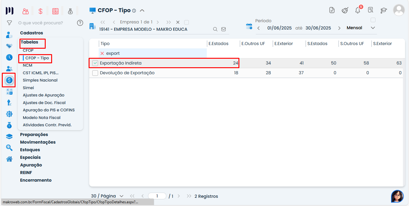 Após a devida configuração para o CFOP do Tipo de Trbutação como Exportação Indireta iremos seguir em: Fiscal > Tabelas > CFOP – Tipo, e iremos abrir o tipo Exportação Indireta.