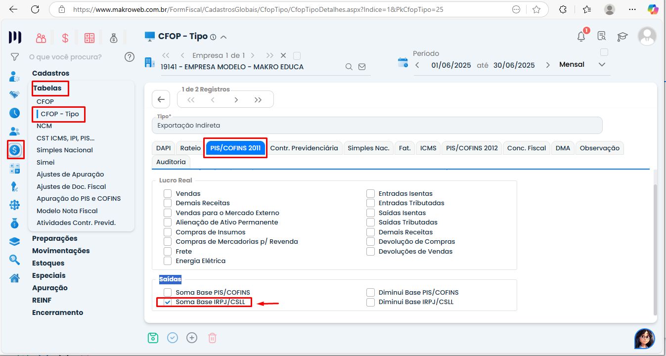 Na aba PIS/COFINS/2011, iremos configurar o campo, Saídas > Soma Base IRPJ/CSLL.