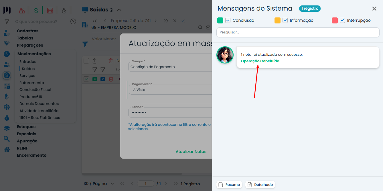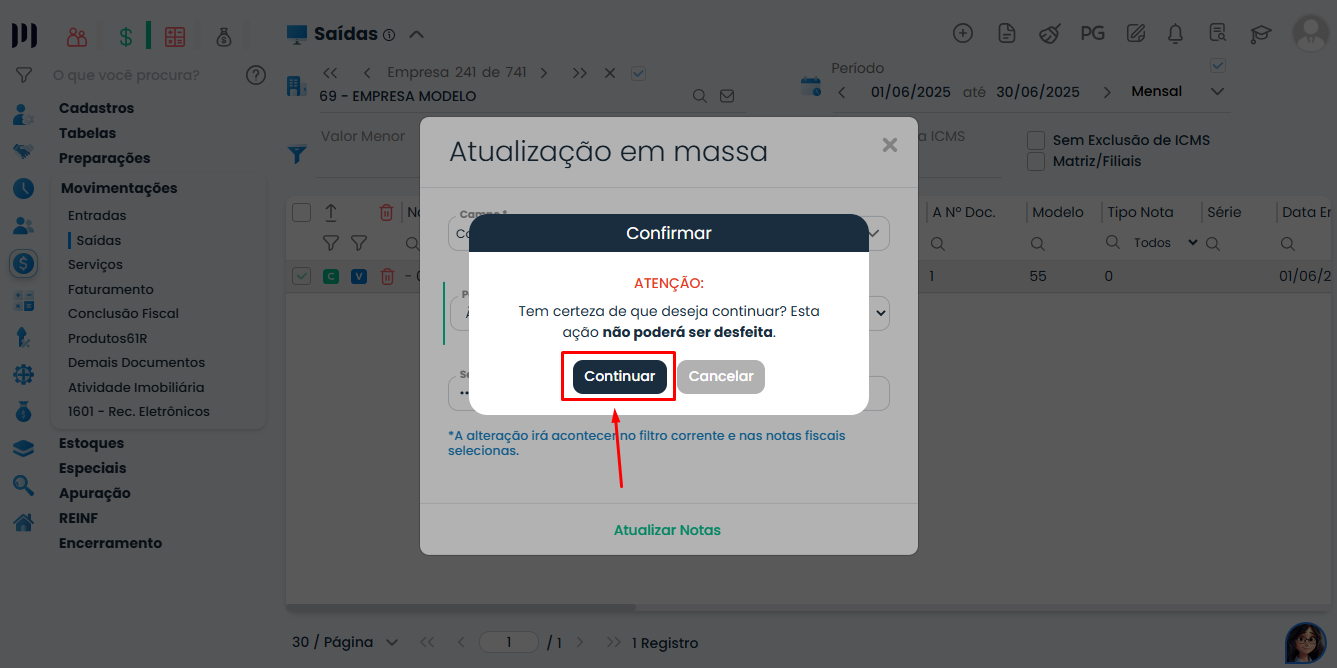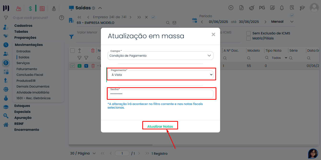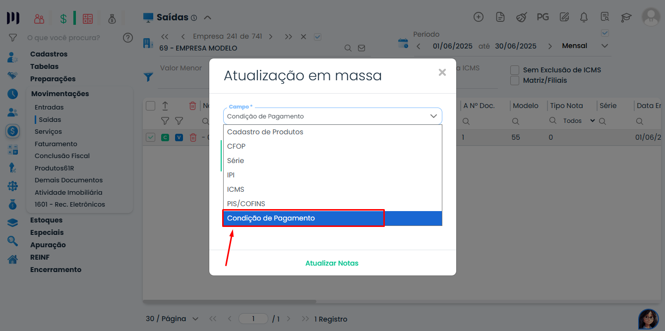 Acesse o módulo: Fiscal > Movimentações > Saídas ou Entradas> Selecionar as Notas Fiscais que deseja alterar a condição de pagamento > clicar em “atualizar registros em massa”