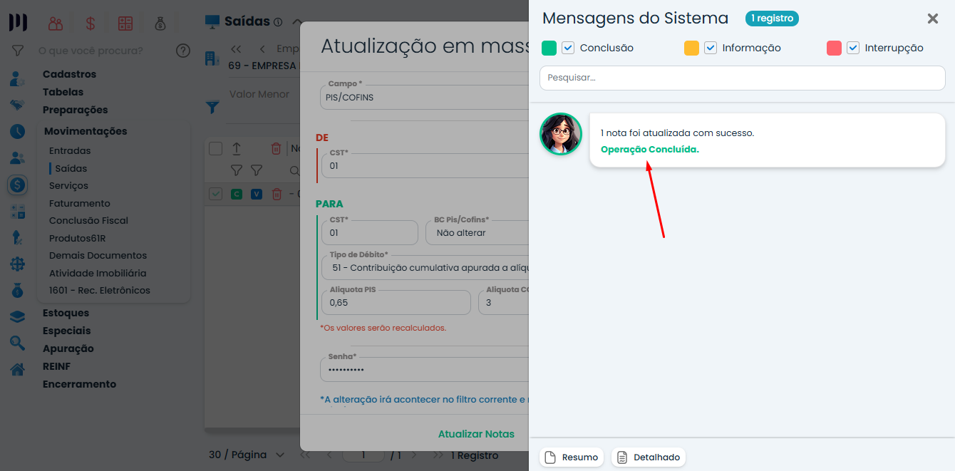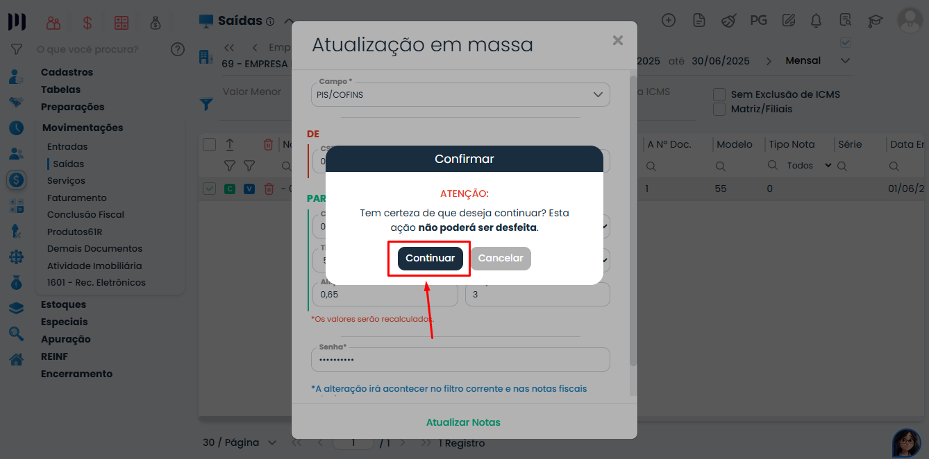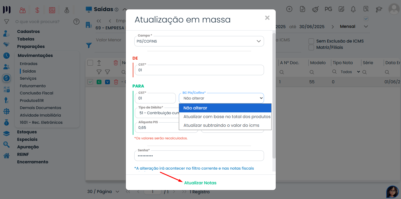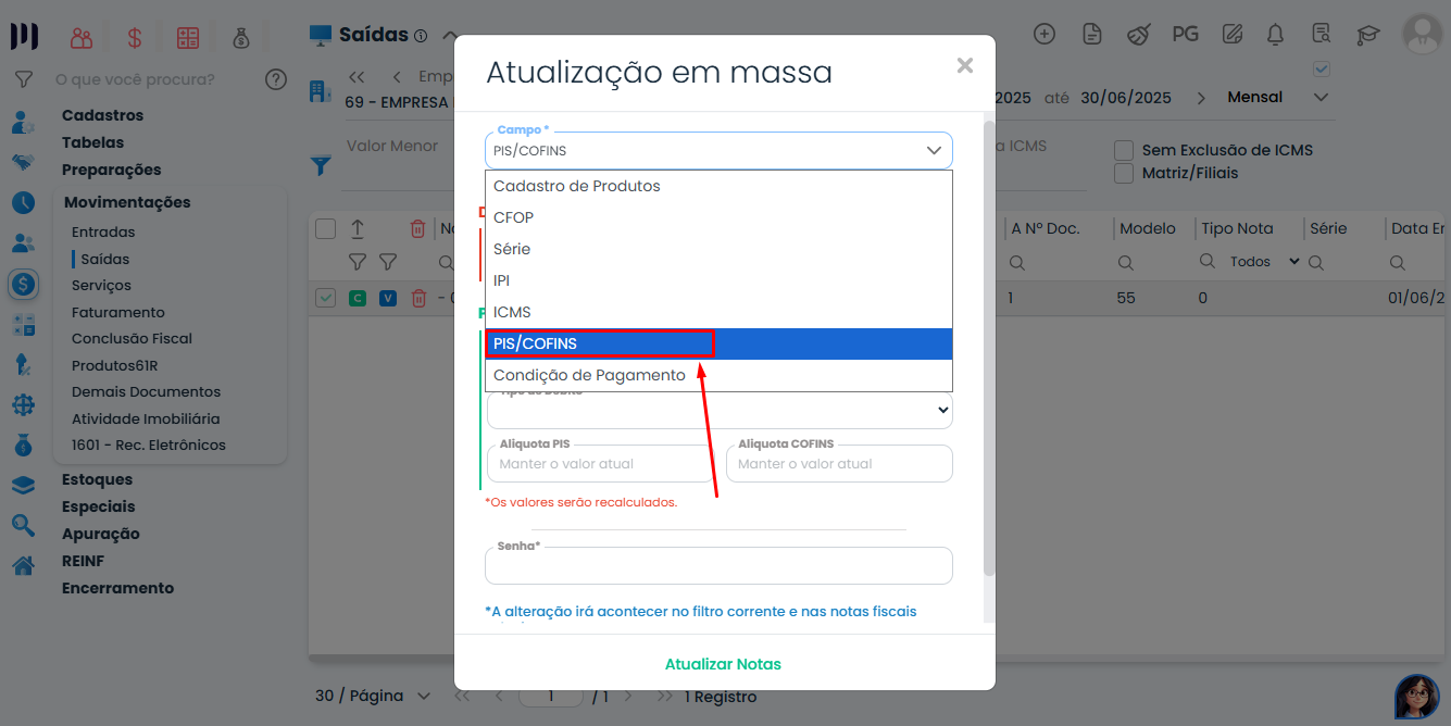 Acesse o módulo: Fiscal > Movimentações > Saídas ou Entradas>  Selecionar as Notas Fiscais que deseja alterar as informações de PIS/COFINS clicar em “Atualizar registros em massa”