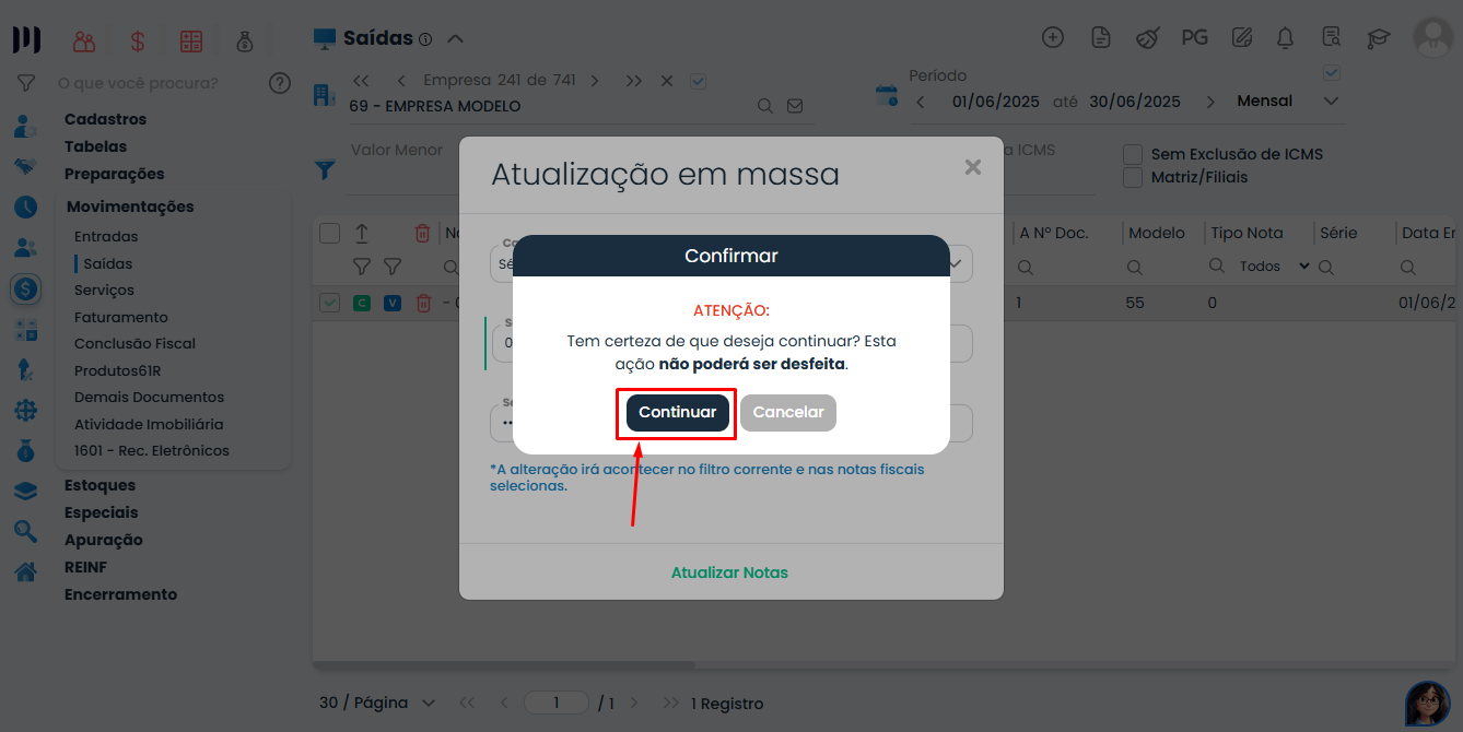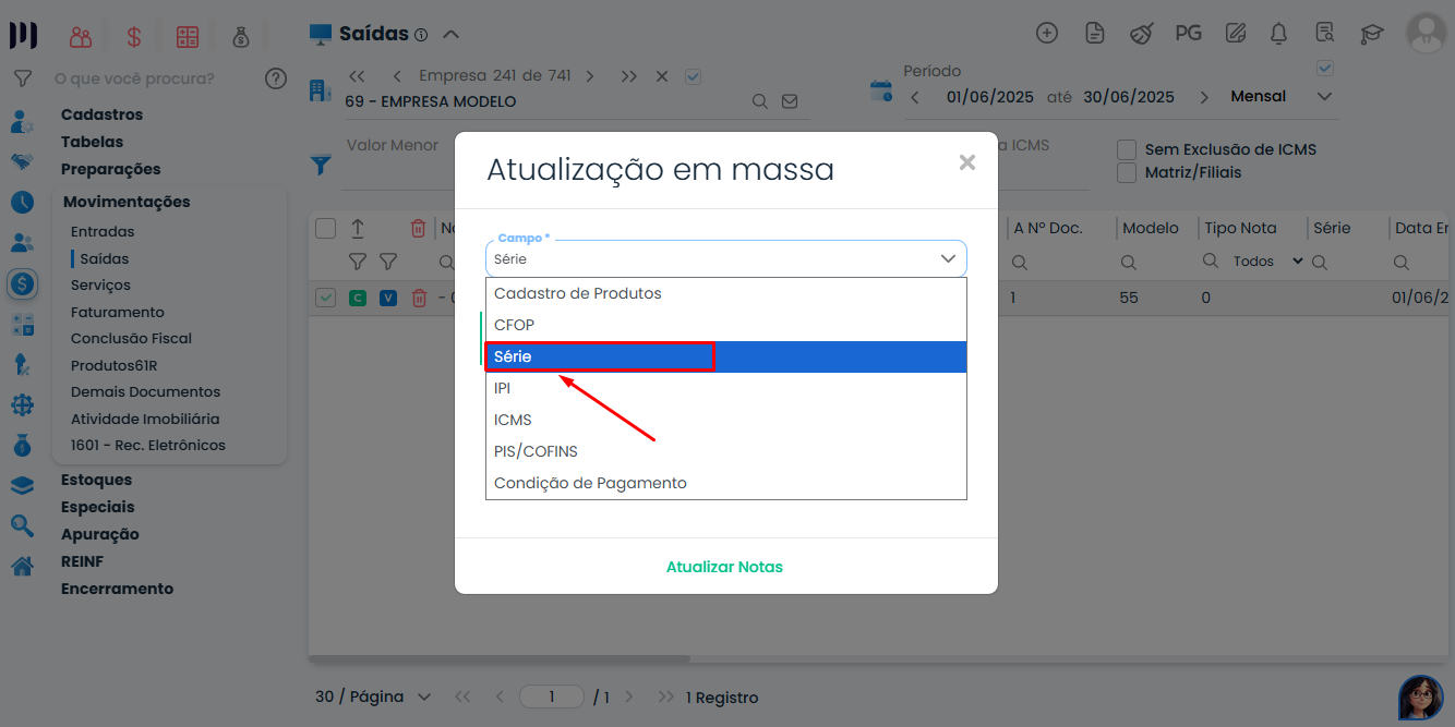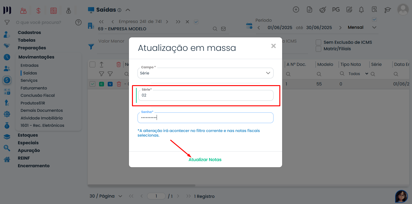 Acesse o módulo: Fiscal > Movimentações > Saídas ou Entradas> Selecionar as Notas Fiscais que deseja alterar a Série > clicar em “Atualizar registros em massa”