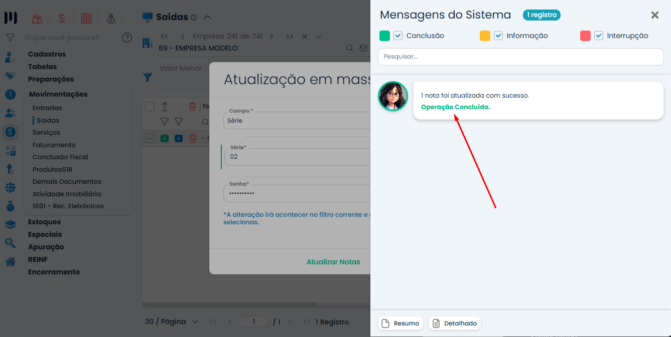 Após a confirmação da operação, o sistema apresentará uma mensagem informando que a atualização das Notas Fiscais foi realizada com sucesso.