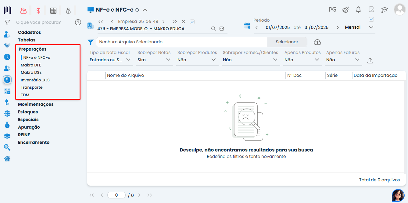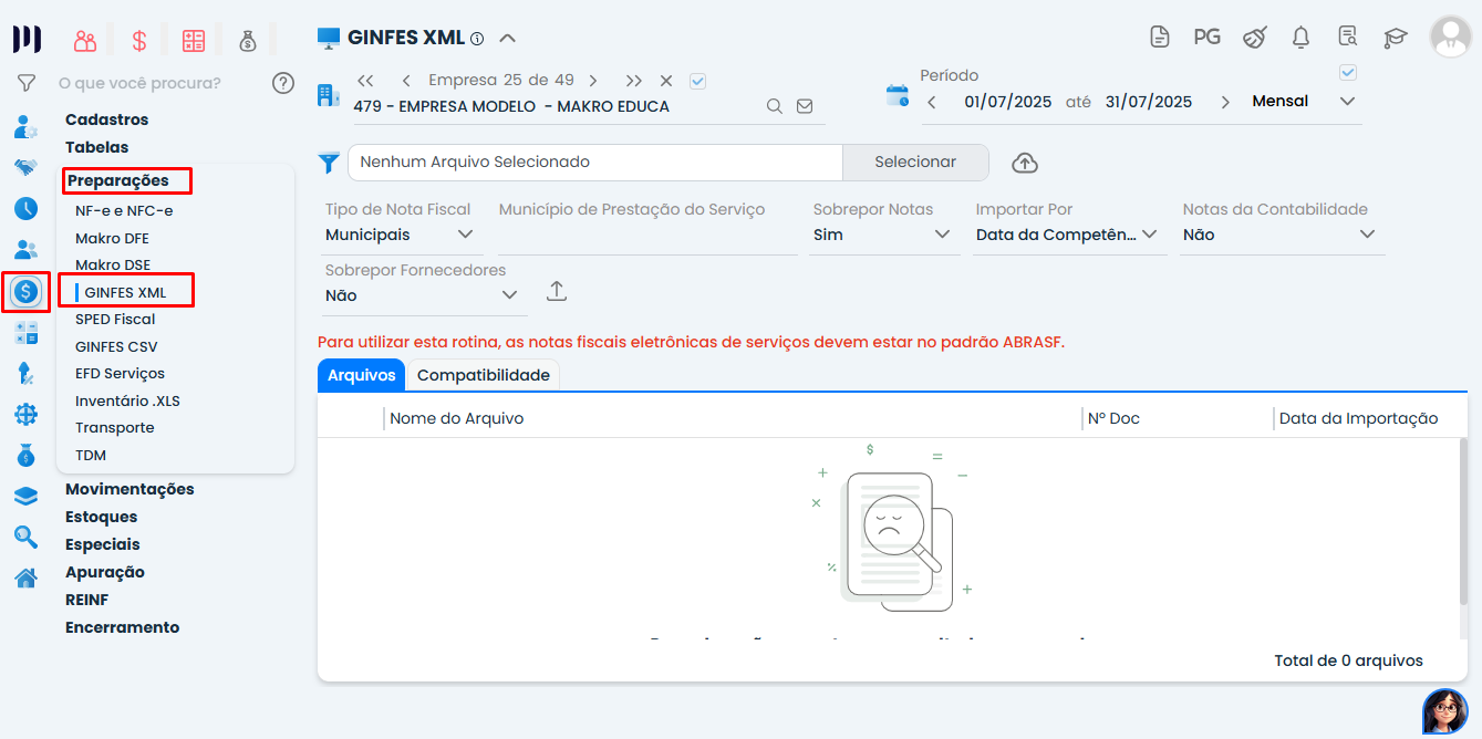 No módulo Fiscal > Preparações não aparece a opção GINFES XML para realizar a importação de notas fiscais de serviços: