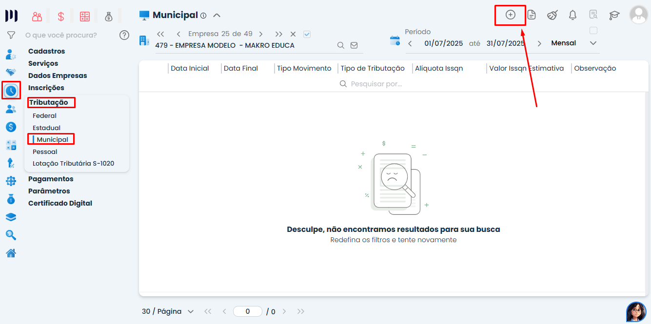 Essa situação ocorre em razão da ausência do cadastro da Tributação Municipal no sistema. Para regularizar essa pendência, é necessário realizar o respectivo cadastro conforme as orientações descritas a seguir: