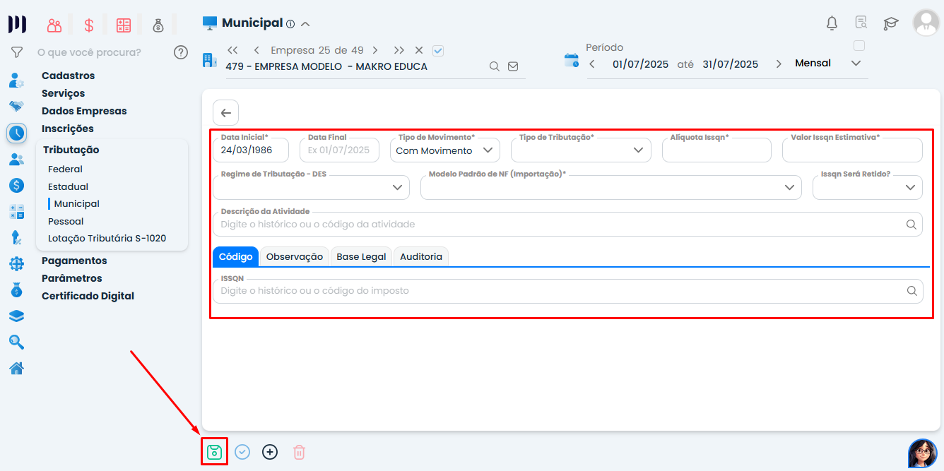 Configure os parâmetros tributários conforme o regime tributário da empresa e para concluir, clique em Salvar (ícone verde) .