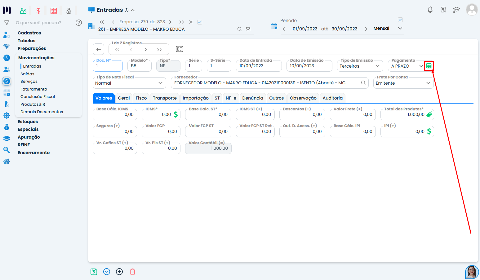 3. Na tela aberta, clique no ícone de calculadora na aba “Pagamentos”