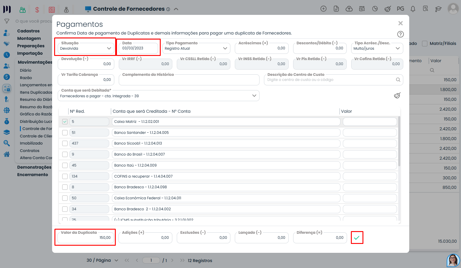 No controle de fornecedores, a parcela de devolução aparecerá baixada