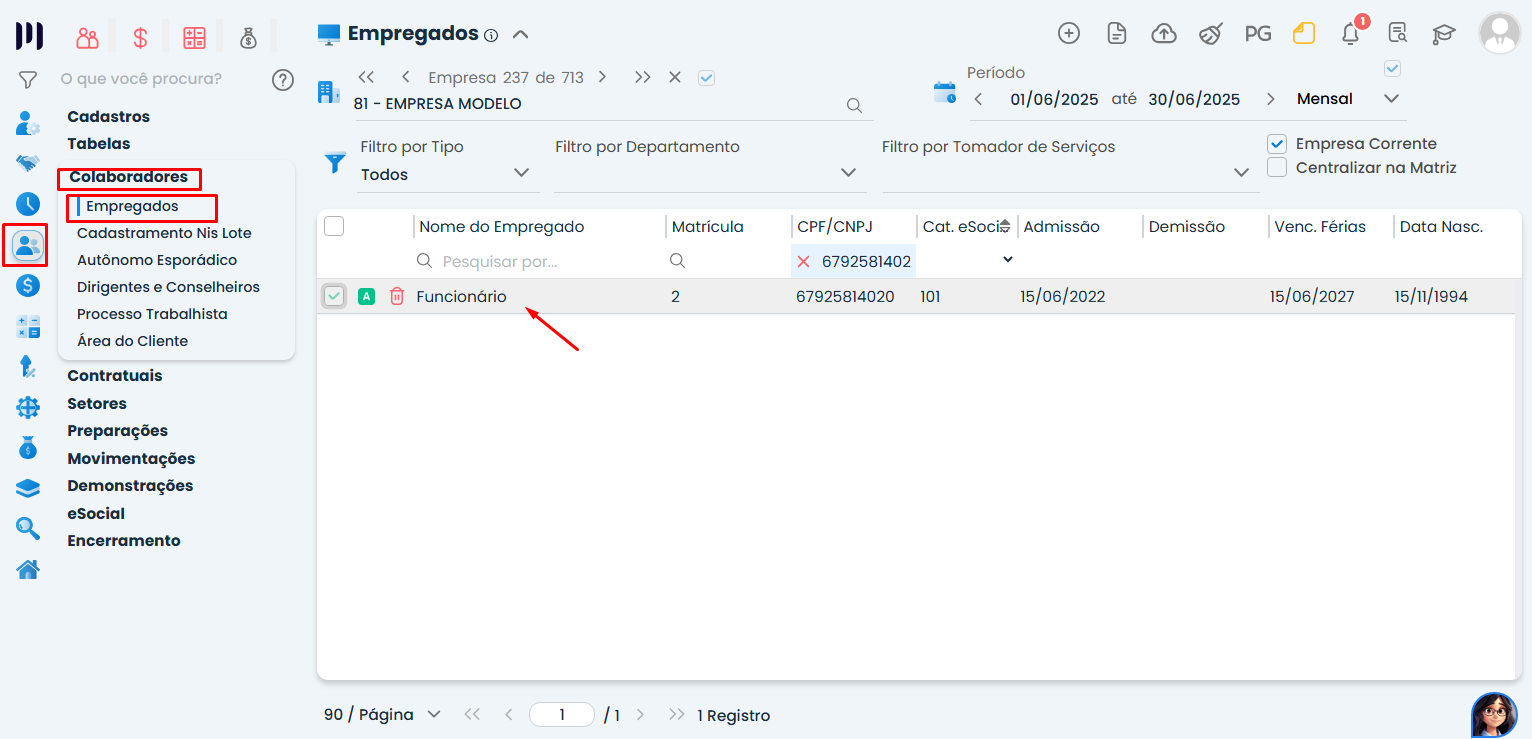 Passo 2: Clique em Pessoal, depois em Colaboradores > Empregados , e então selecione o funcionario