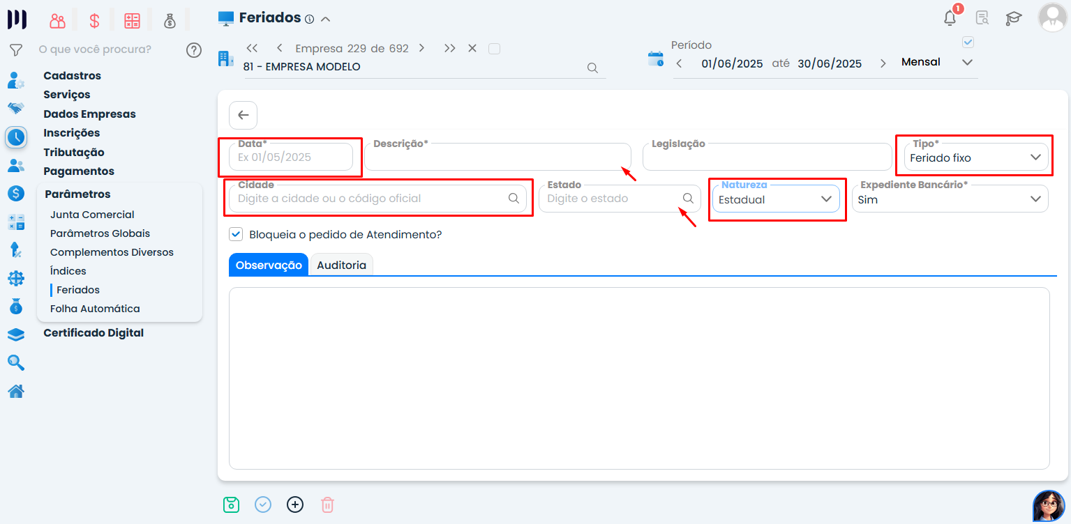 Sempre confira se a data e o tipo de feriado estão corretos antes de salvar.