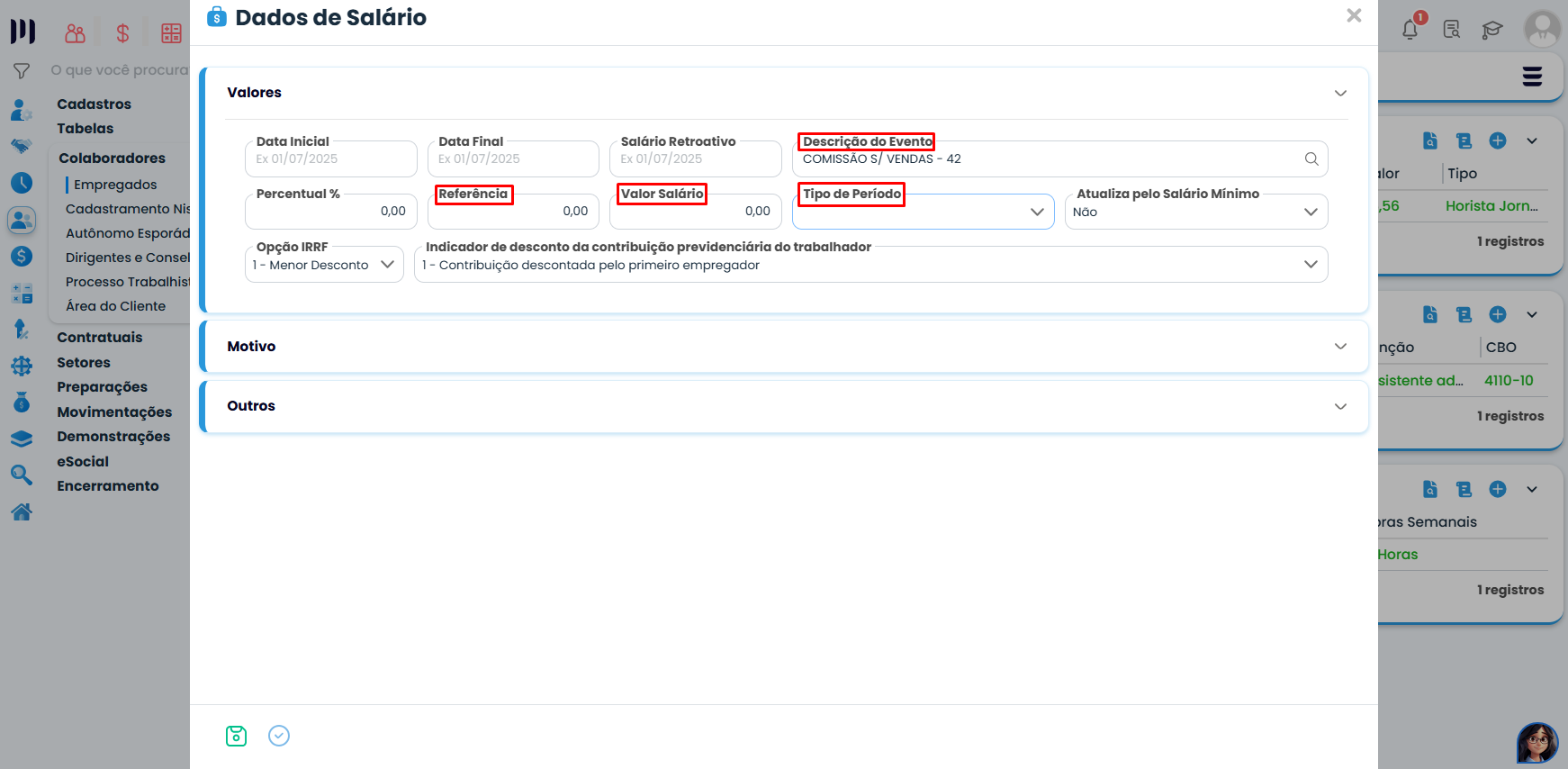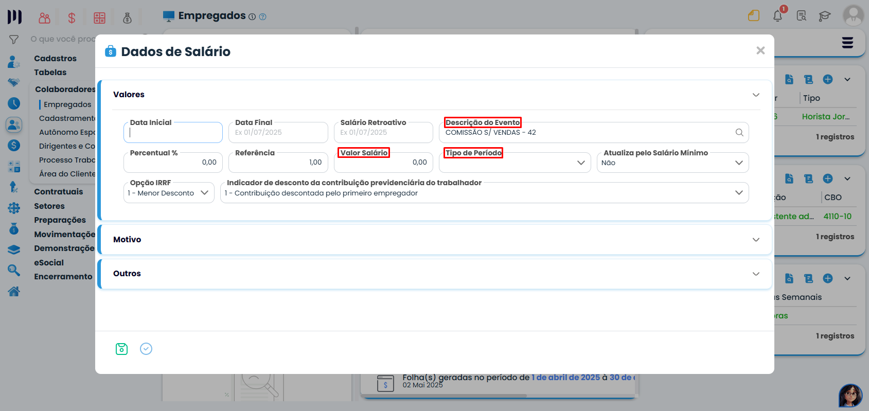 Na aba “Outros”, insira o valor da garantia mínima. Esse valor será utilizado caso o funcionário não atinja o valor da comissão para garantir o complemento salarial.