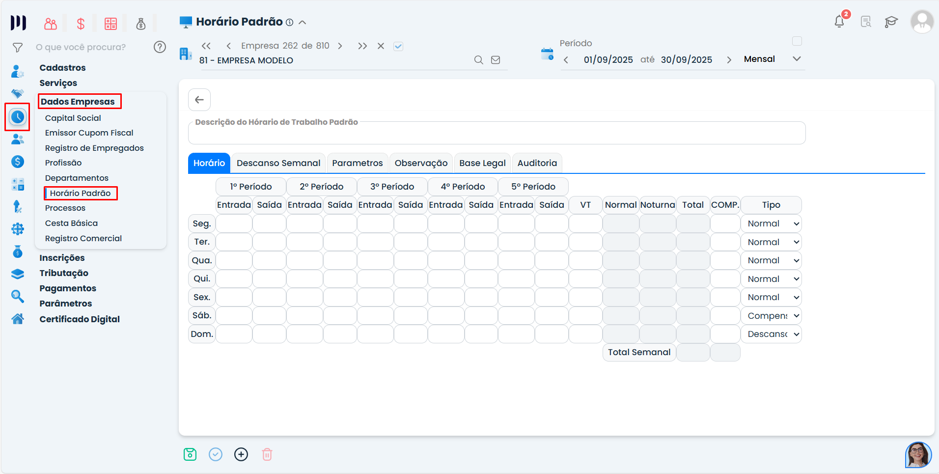 Passo 3: Preencha os campos com os dados do horário desejado, como jornada semanal, início e fim do expediente, dias trabalhados, entre outros.