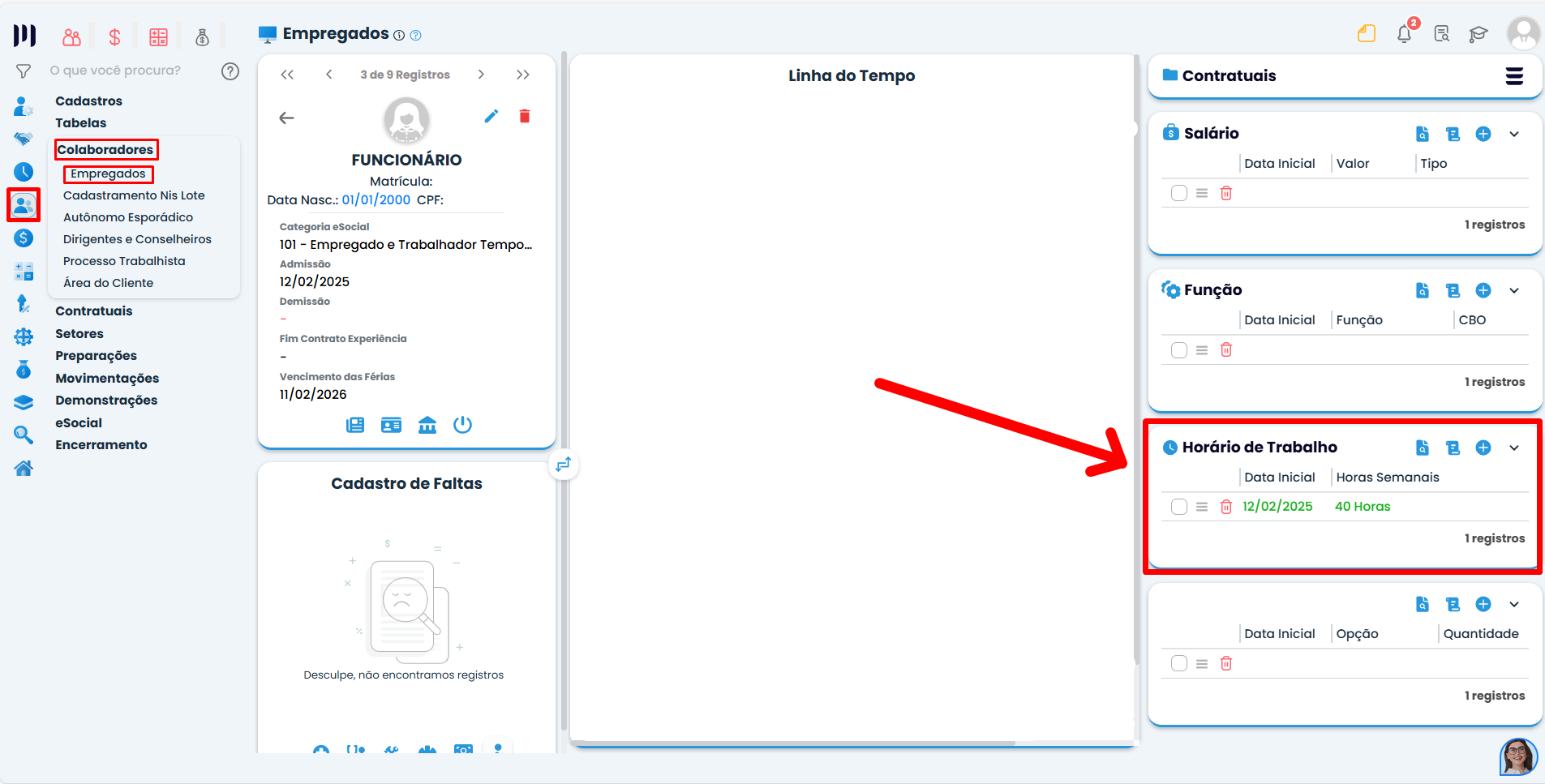 Passo 6: Para aplicar esse horário no cadastro de um funcionário, vá até o cadastro do colaborador e localize a aba Horário pré-definido.