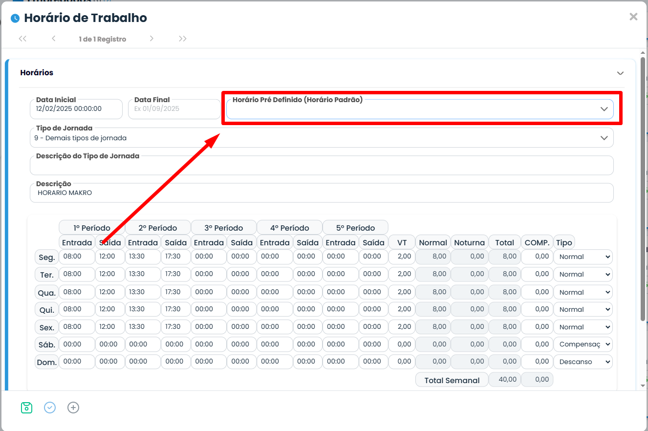 Passo 7: Selecione o nome do horário padrão cadastrado anteriormente.