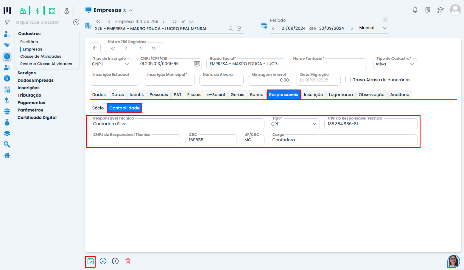 • Na tela de cadastro da empresa, localize a aba Responsável.