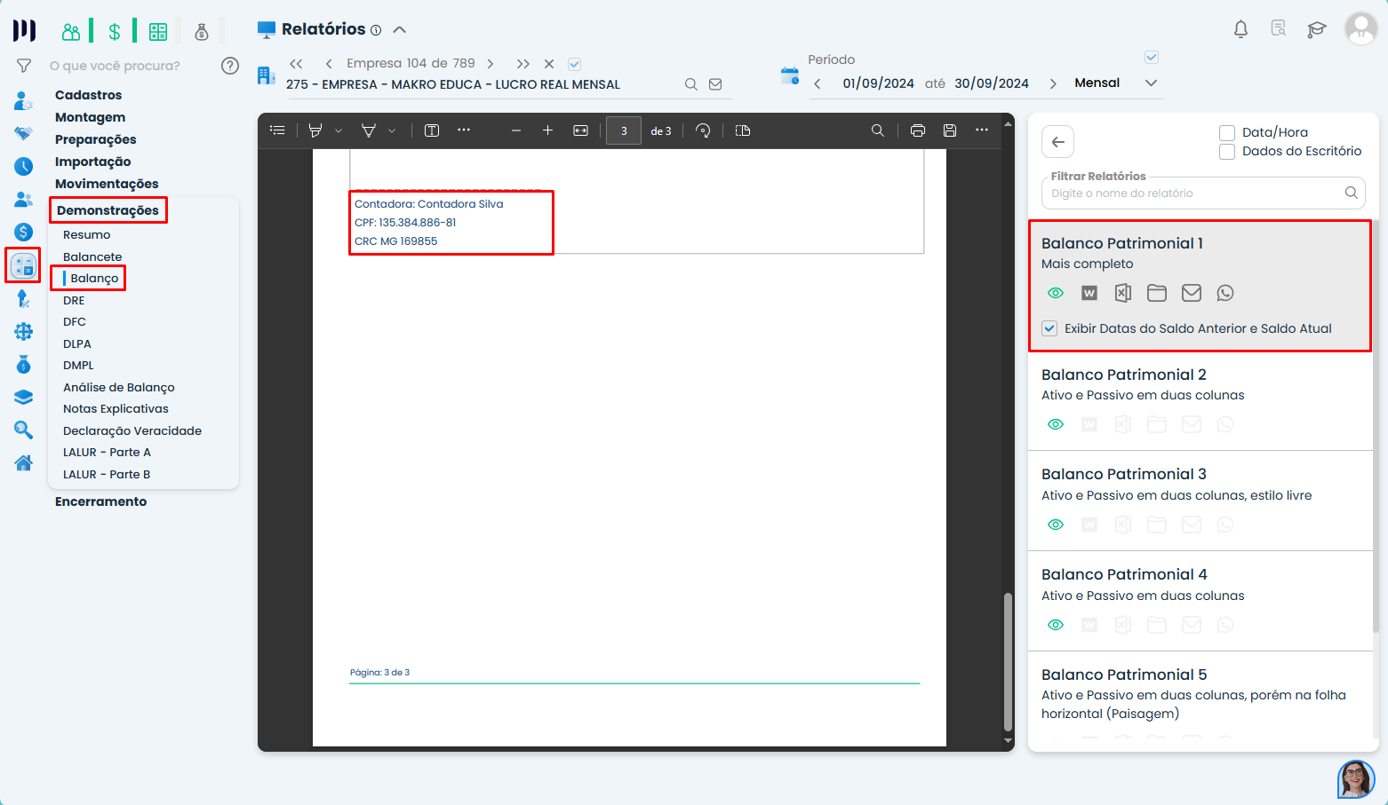 • Gere o relatório. O sistema irá incluir automaticamente a assinatura do contador cadastrado.