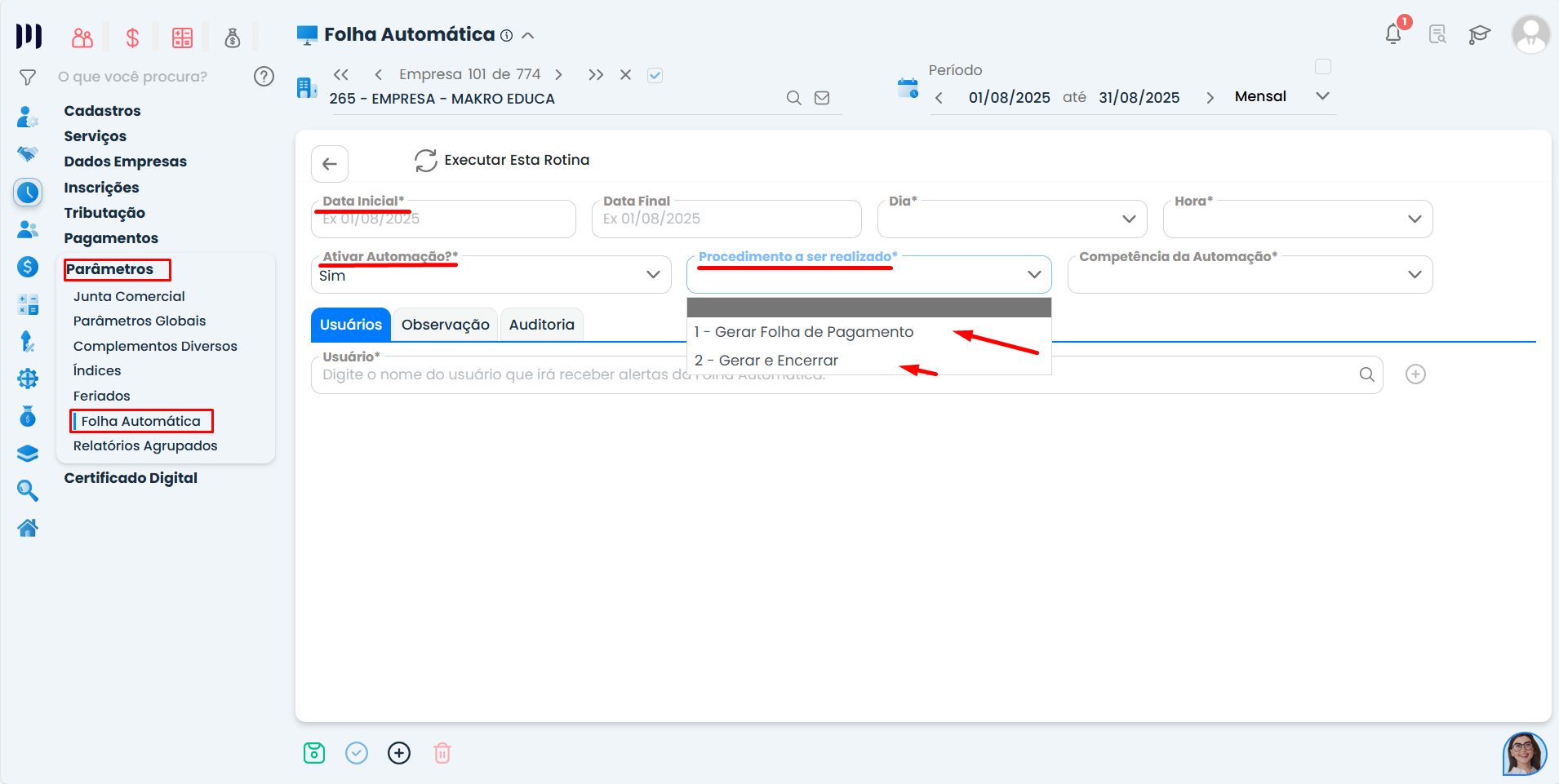 O que é? Este é o dia em que você deseja que a automação comece a gerar a folha de pagamento;