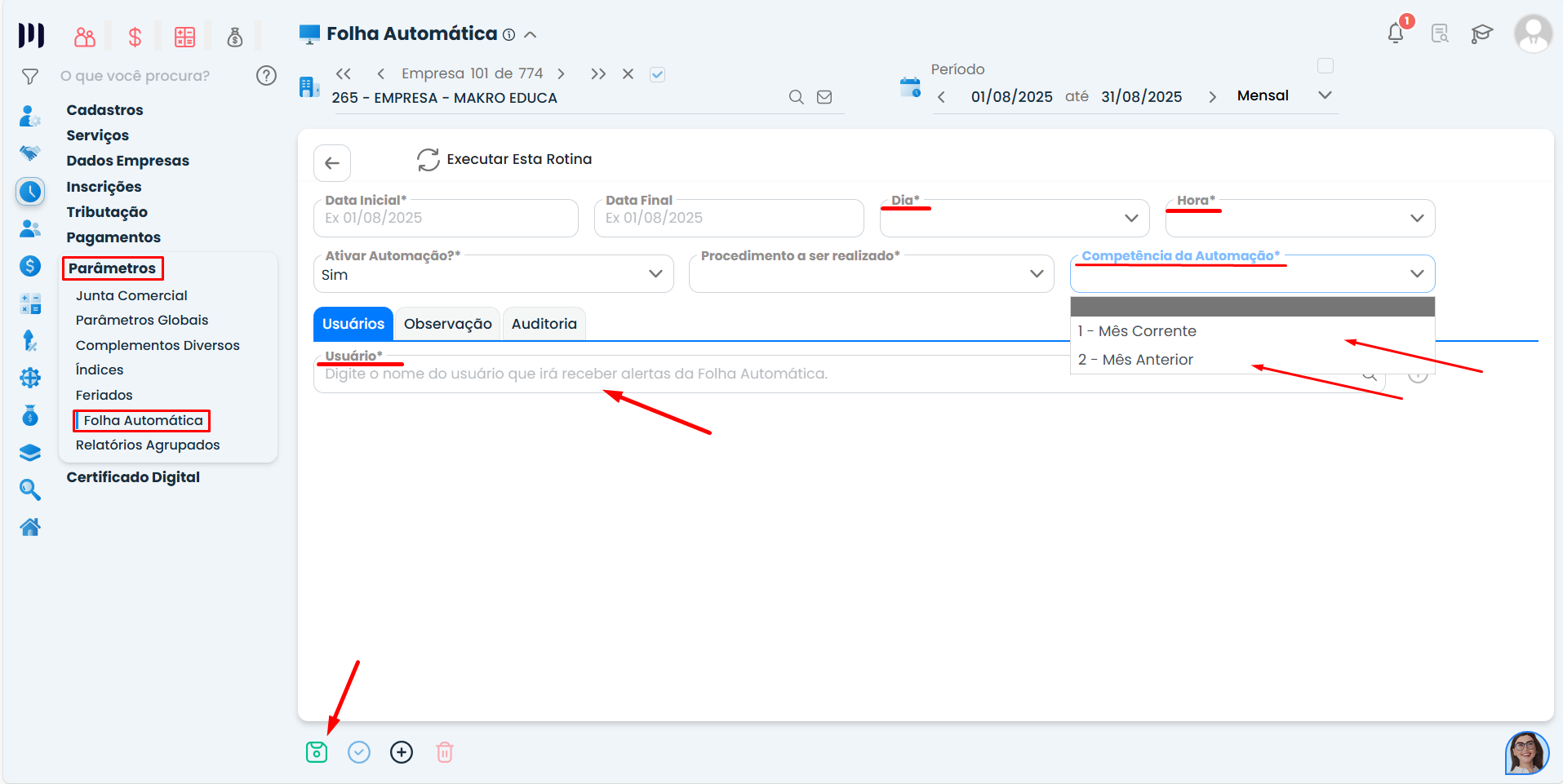 Exemplo: Se escolher Mês Corrente no dia 30 de janeiro, a folha será gerada para janeiro. Se escolher Mês Anterior no dia 5 de janeiro, a automação ocorrerá para dezembro.