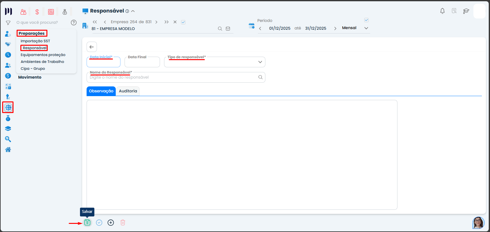 Passo 1: Acesse o menu: SESMT>Preparações>Responsável;