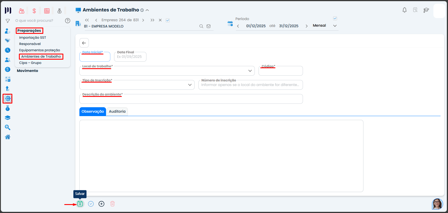 Passo 2: Acesse o menu: SESMT>Preparações>Ambientes de trabalho;