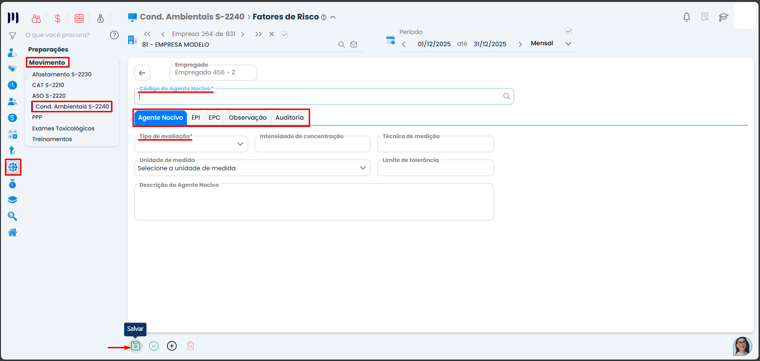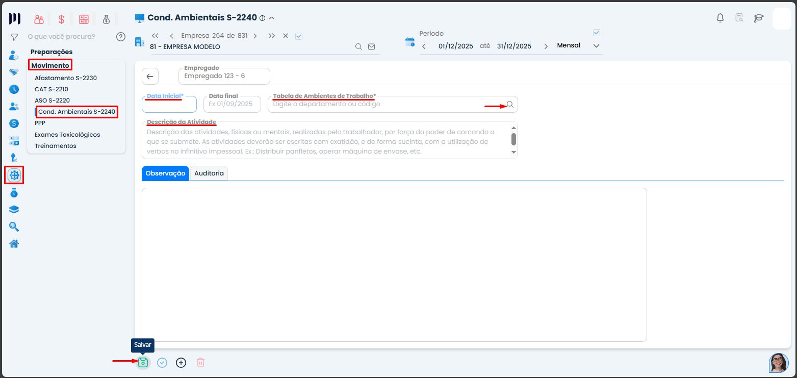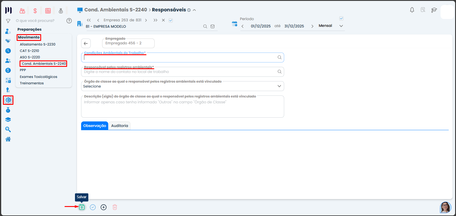 Passo 4: Acesse o menu SESMT>Movimento>Cond. Ambientais S-2240;