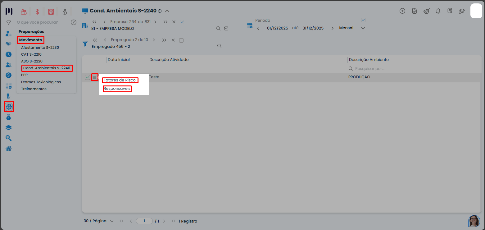 Passo 5: Clique no subnível do cadastro criado, localize a área de cadastro dos fatores de risco e do responsável técnico pelo ambiente;