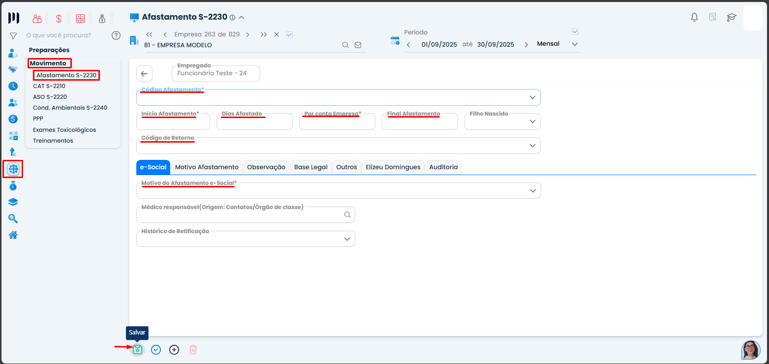 • Na aba eSocial, preencha o campo Motivo afastamento eSocial;