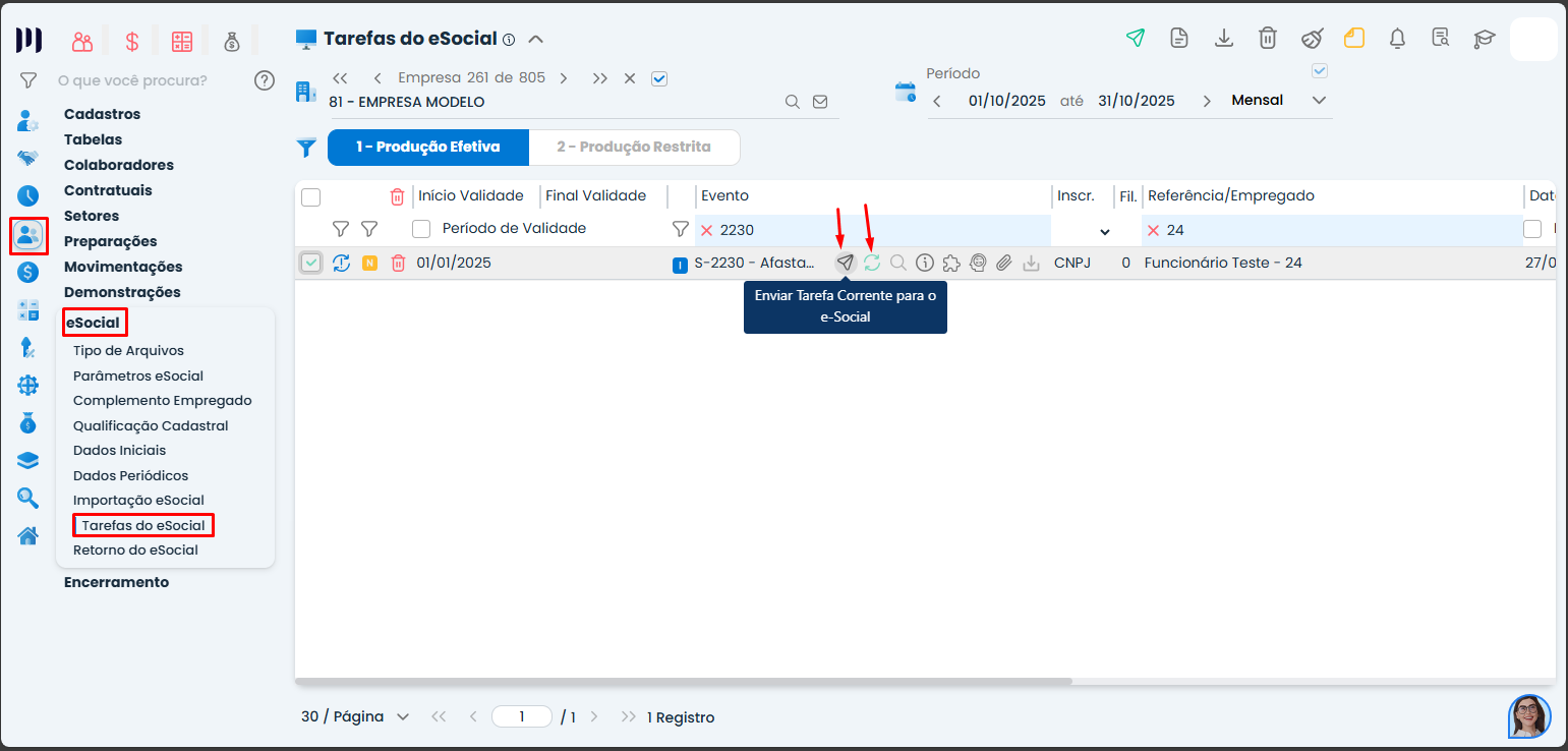Passo 1: Acesse Pessoal>eSocial>Tarefas do eSocial;