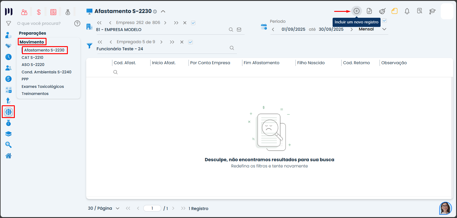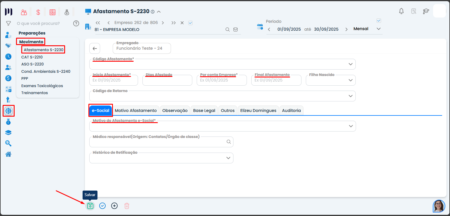 Passo 1: Acesse o menu SESMT>Movimento>Afastamento S-2230;
