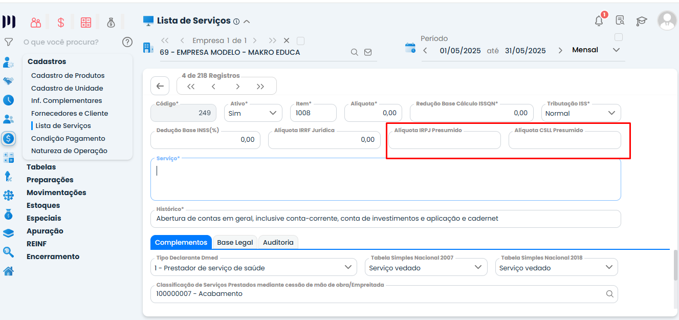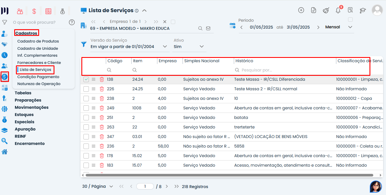 Fiscal > Cadastros > Lista de Serviços - Pesquise pela atividade desejada (ex.: consultoria, manutenção, saúde etc.)